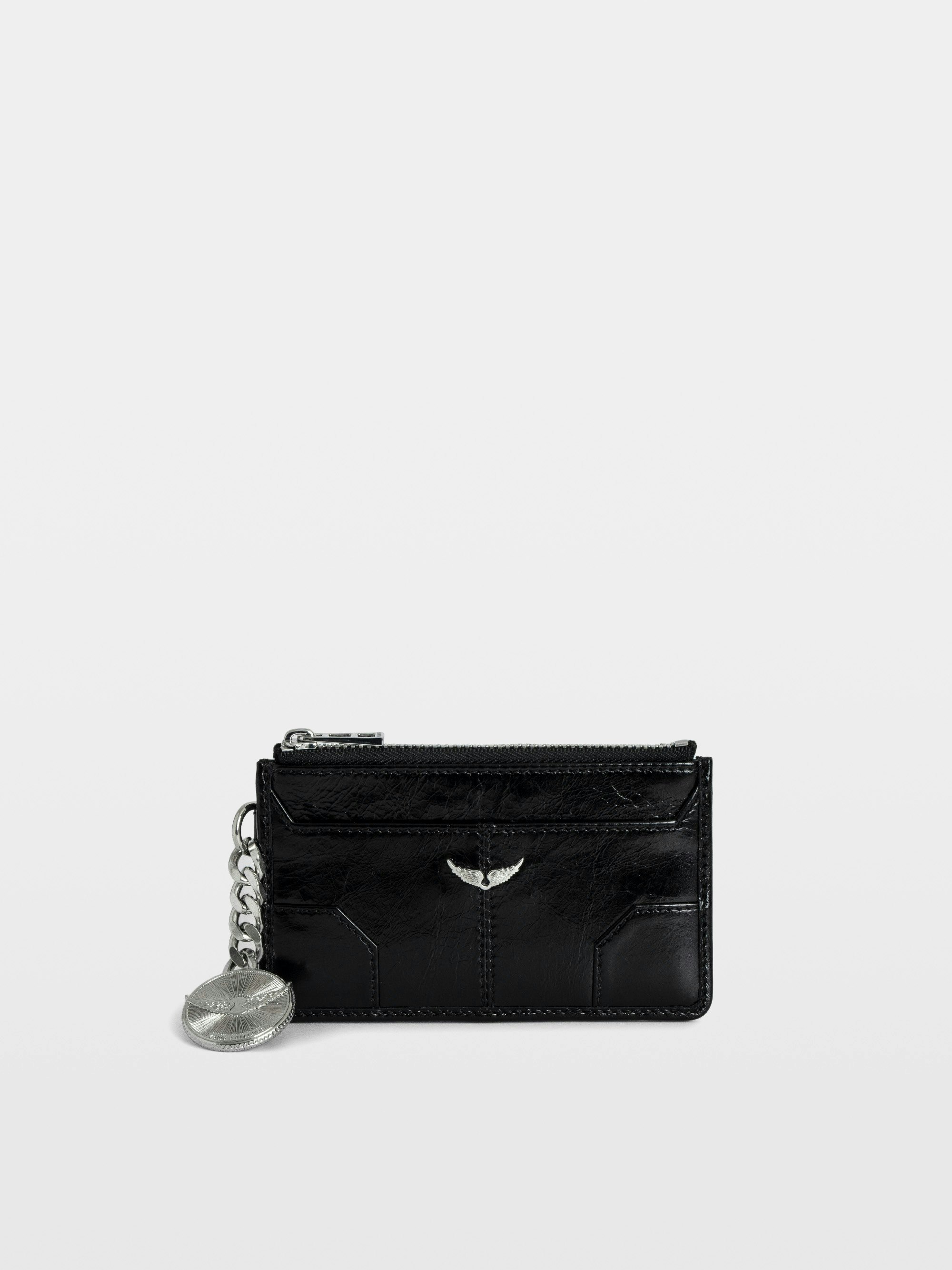 Tarjetero de charol efecto vintage con charm de medallón y firmas de alas.Ver más