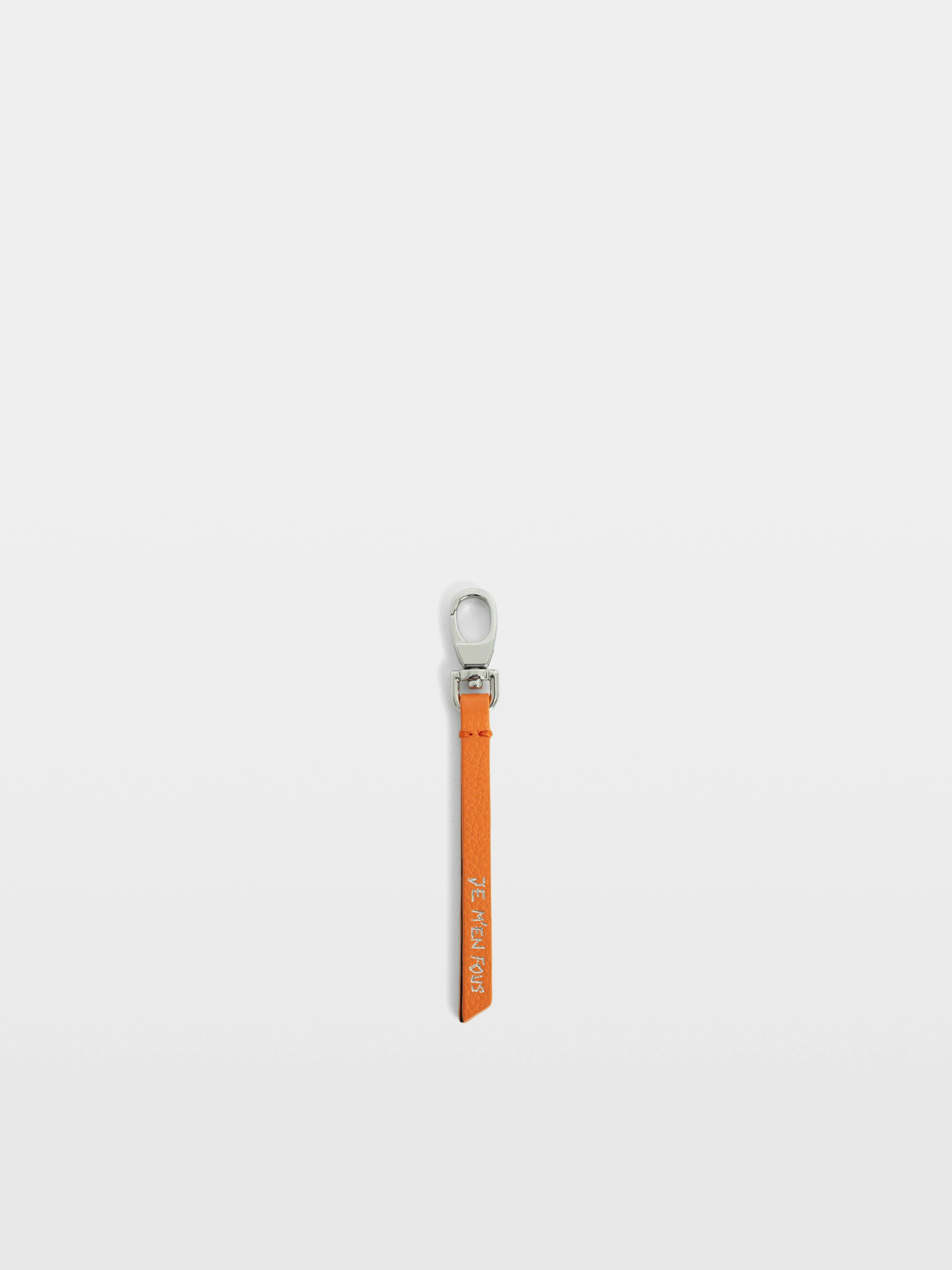 Llavero de correa en cuero granulado con mensaje 'Je m'en fous'.