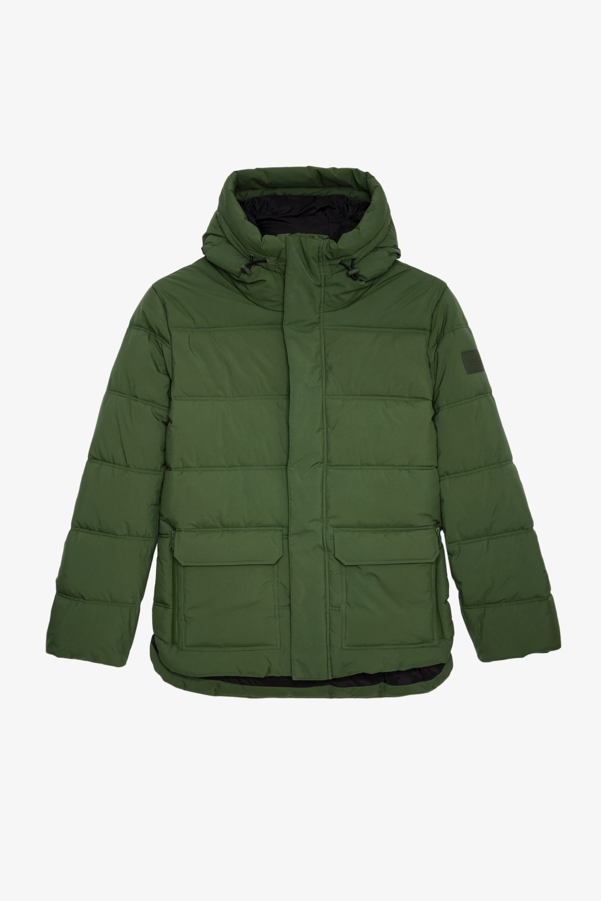 Plumífero acolchado verde con capucha, con insignia de estudio ZV.Ver más