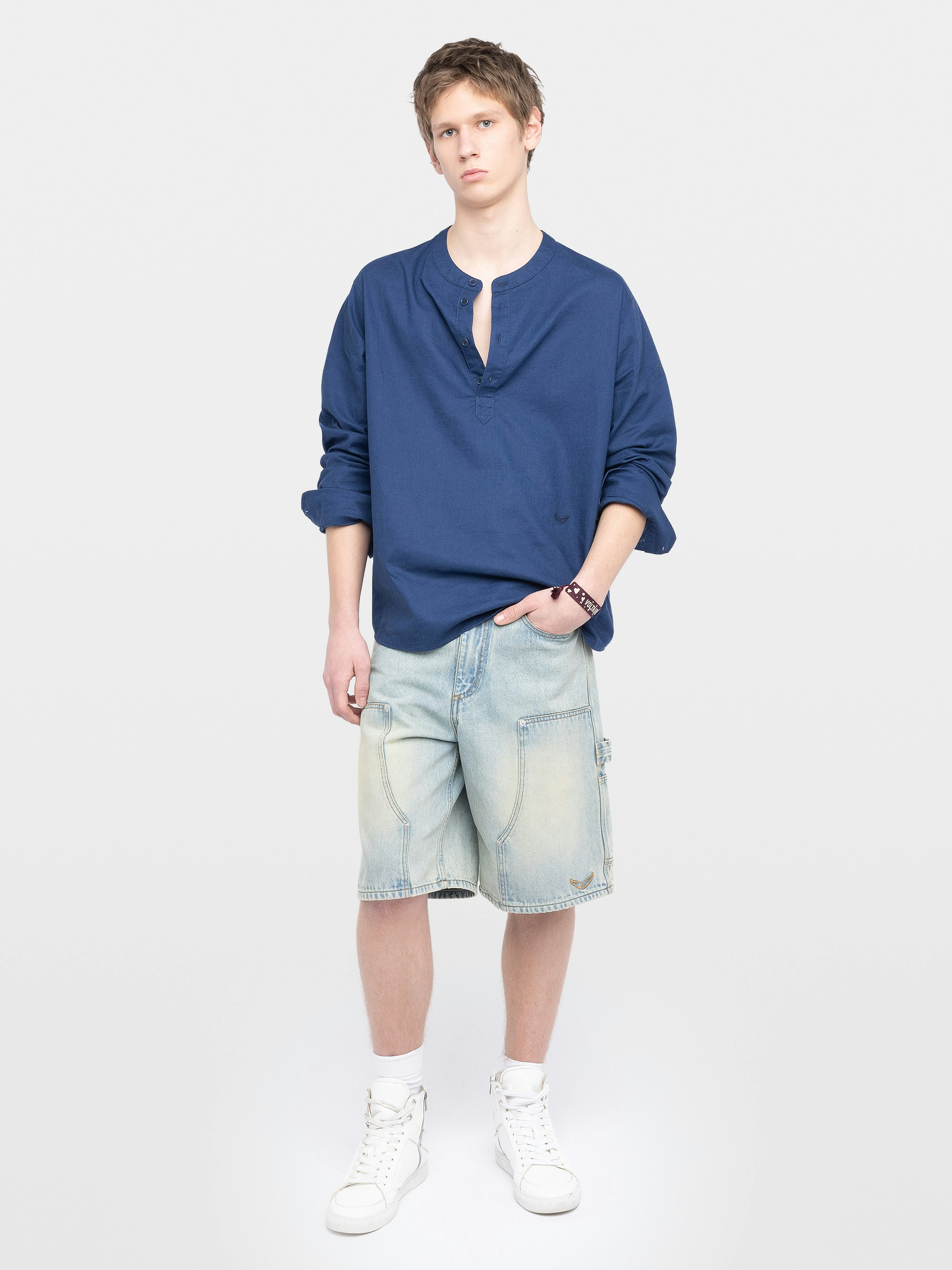 Camisa ligera con cuello Henley, cierre abotonado, mangas sutilmente abullonadas, bordado de alas distintivo.