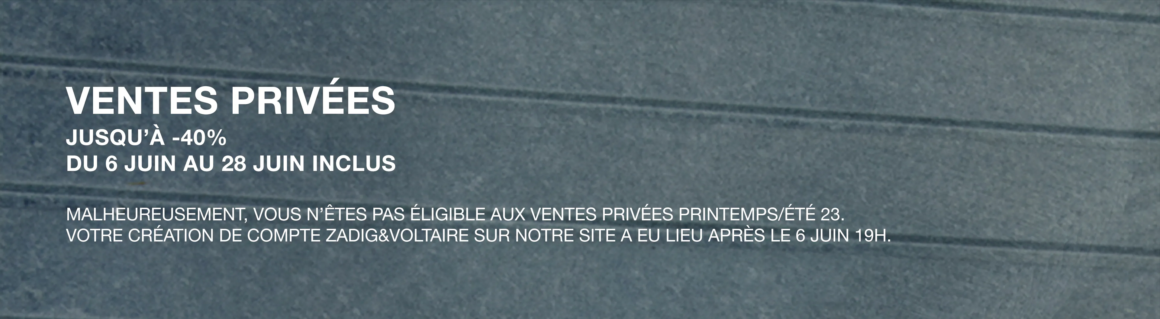 Ventes Privées Printemps/Été 2023 : Offre valable sur www.zadig-et-voltaire.com aux personnes possédant un compte Zadig&Voltaire sur notre site avant le 6 juin 2023 19h. Offre valable du mardi 6 juin 2022 20h au mercredi 28 juin 2023 8h. Offre non cumulable et réservée aux particuliers.