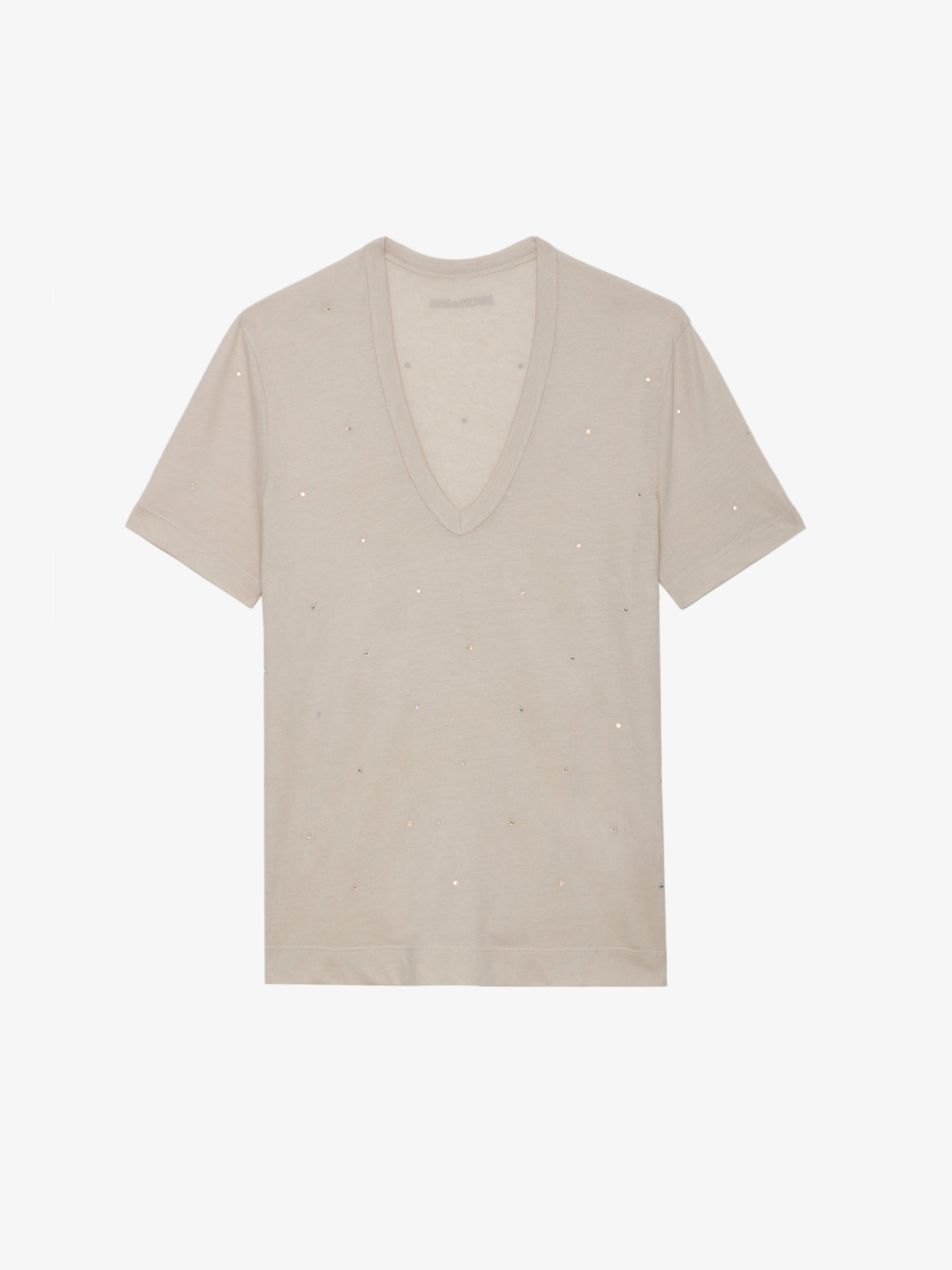 T-shirt rose clair à col V, manches courtes et strass.Voir plus