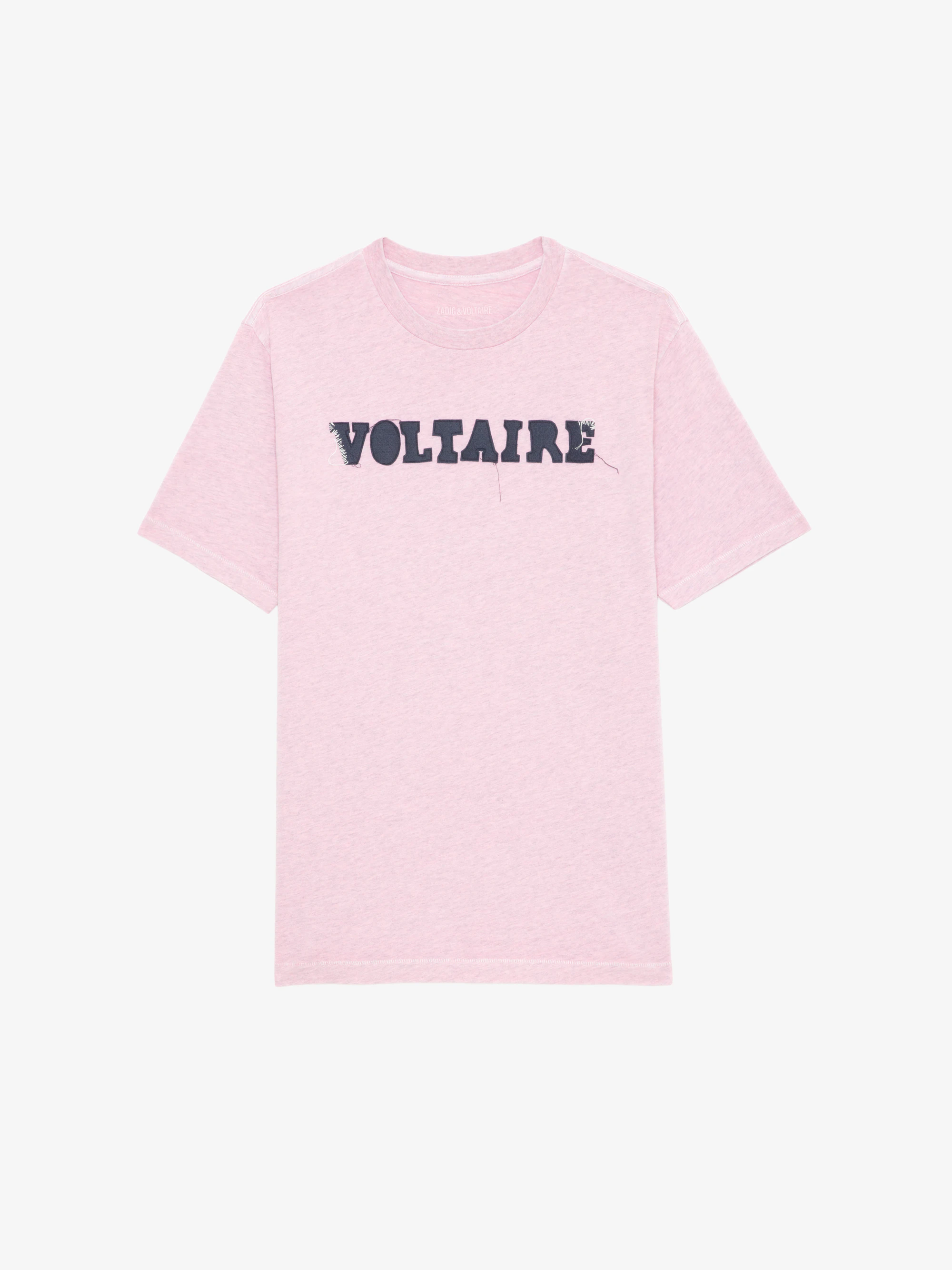 T-shirt en coton biologique rose à manches courtes et imprimé patch "Voltaire" effet usé à l'avant.Voir plus