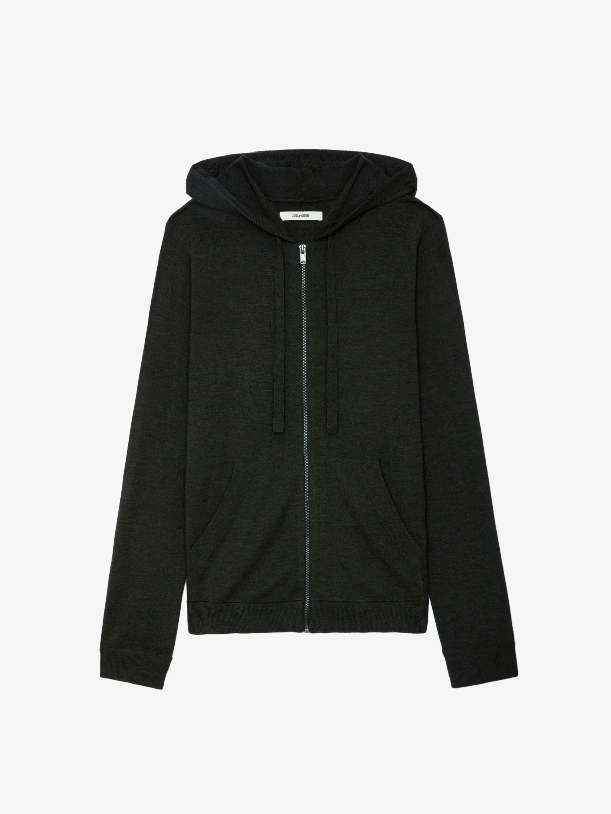 Cardigan zippé en 100% laine mérinos kaki à manches longues et broderie Z.Voltaire sur la capuche.Voir plus