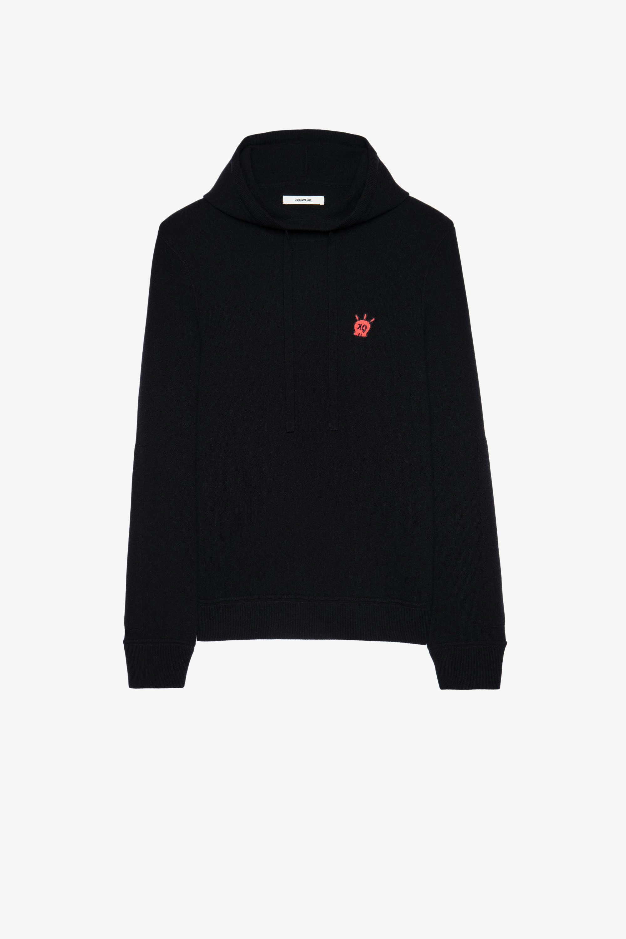 Pull à capuche noir en laine mérinos orné d'un patch skull HommeVoir plus