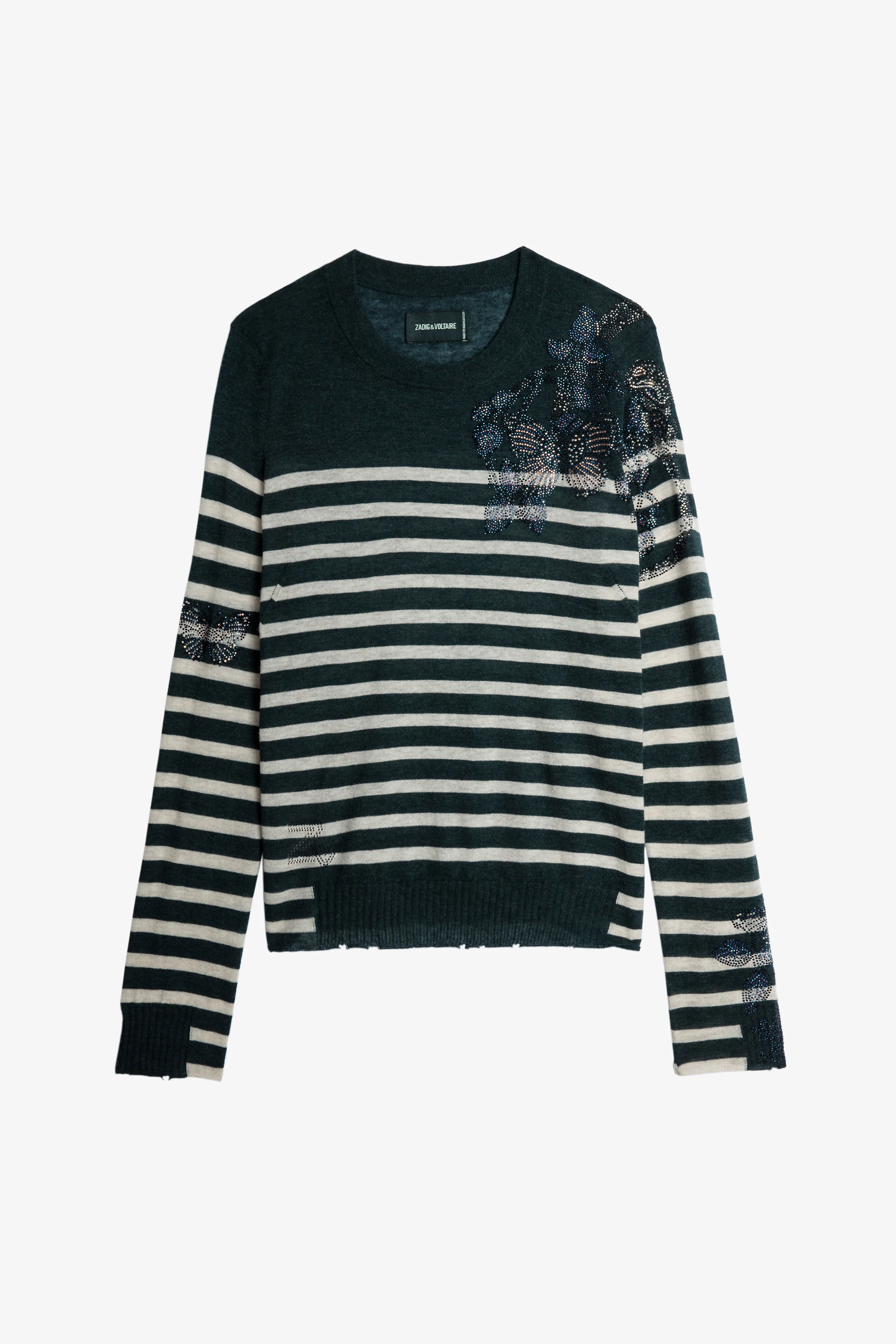 Une maille 100% cachemire dévoile des rayures contrastées et un motif orné de cristaux à l'épaule.