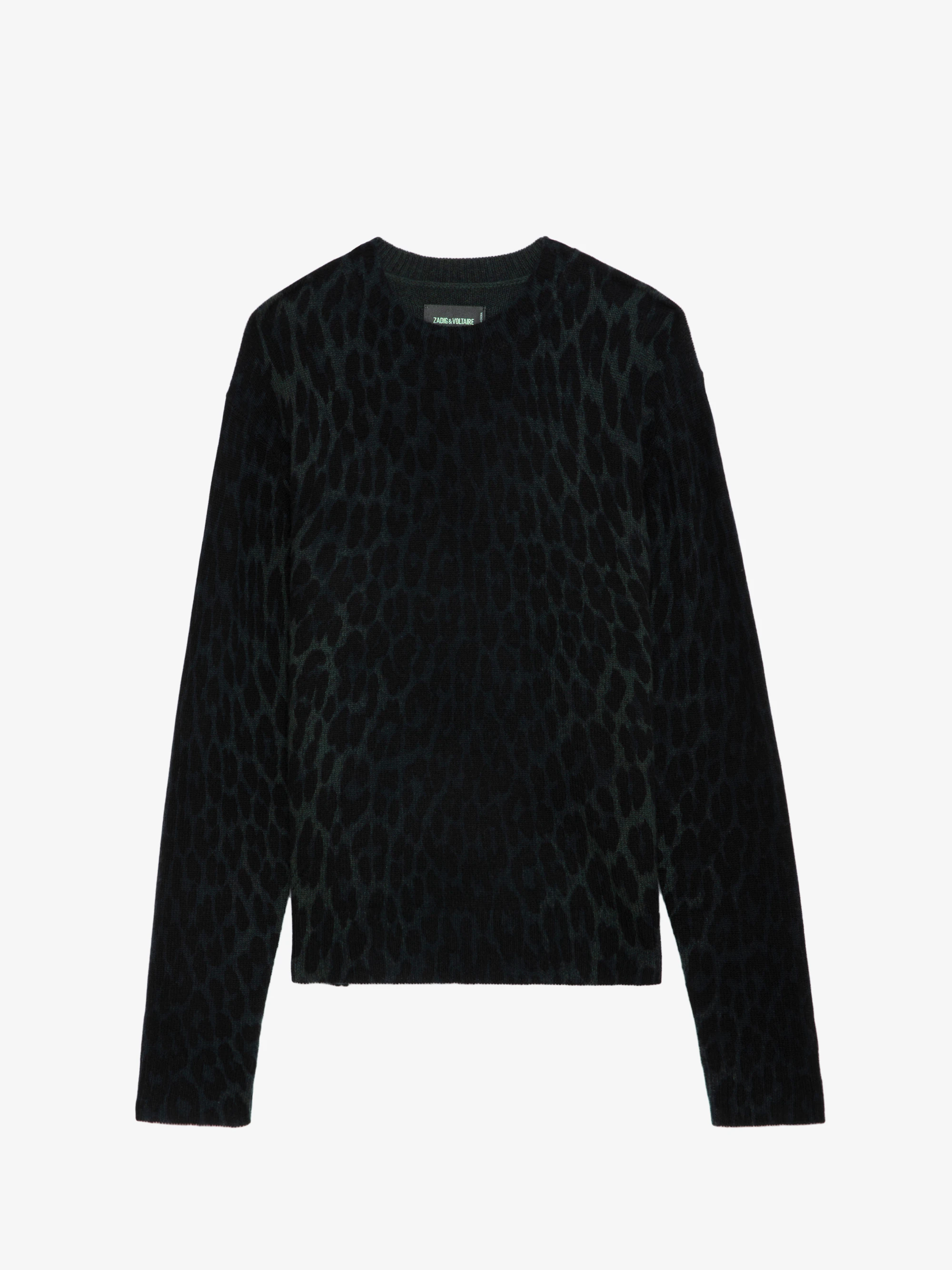 Pull en 100% cachemire vert foncé à imprimé léopard et manches longues.Voir plus