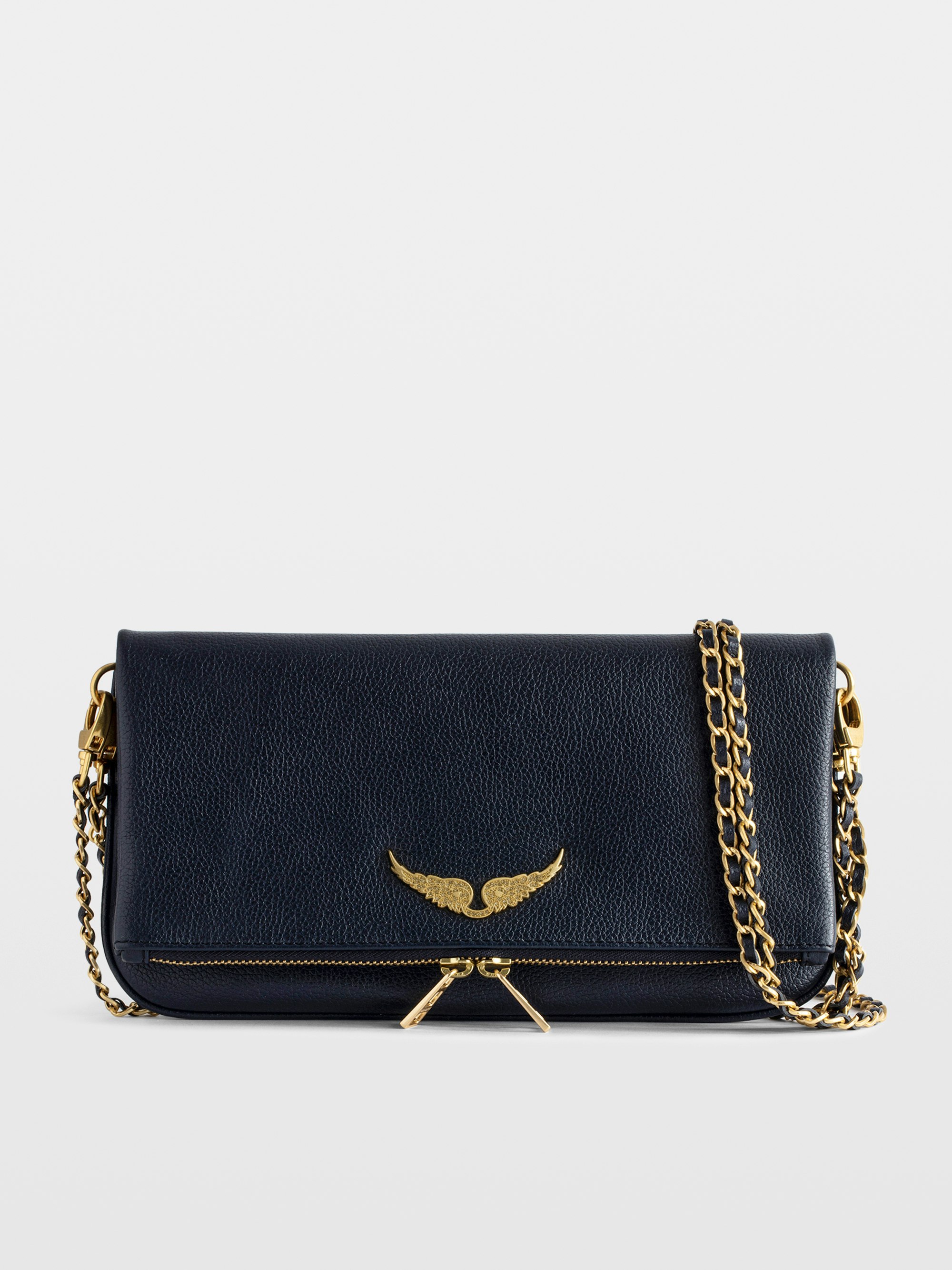 Pochette en cuir grainé à double chaînes cuir et métal et ailes ornées de strass.