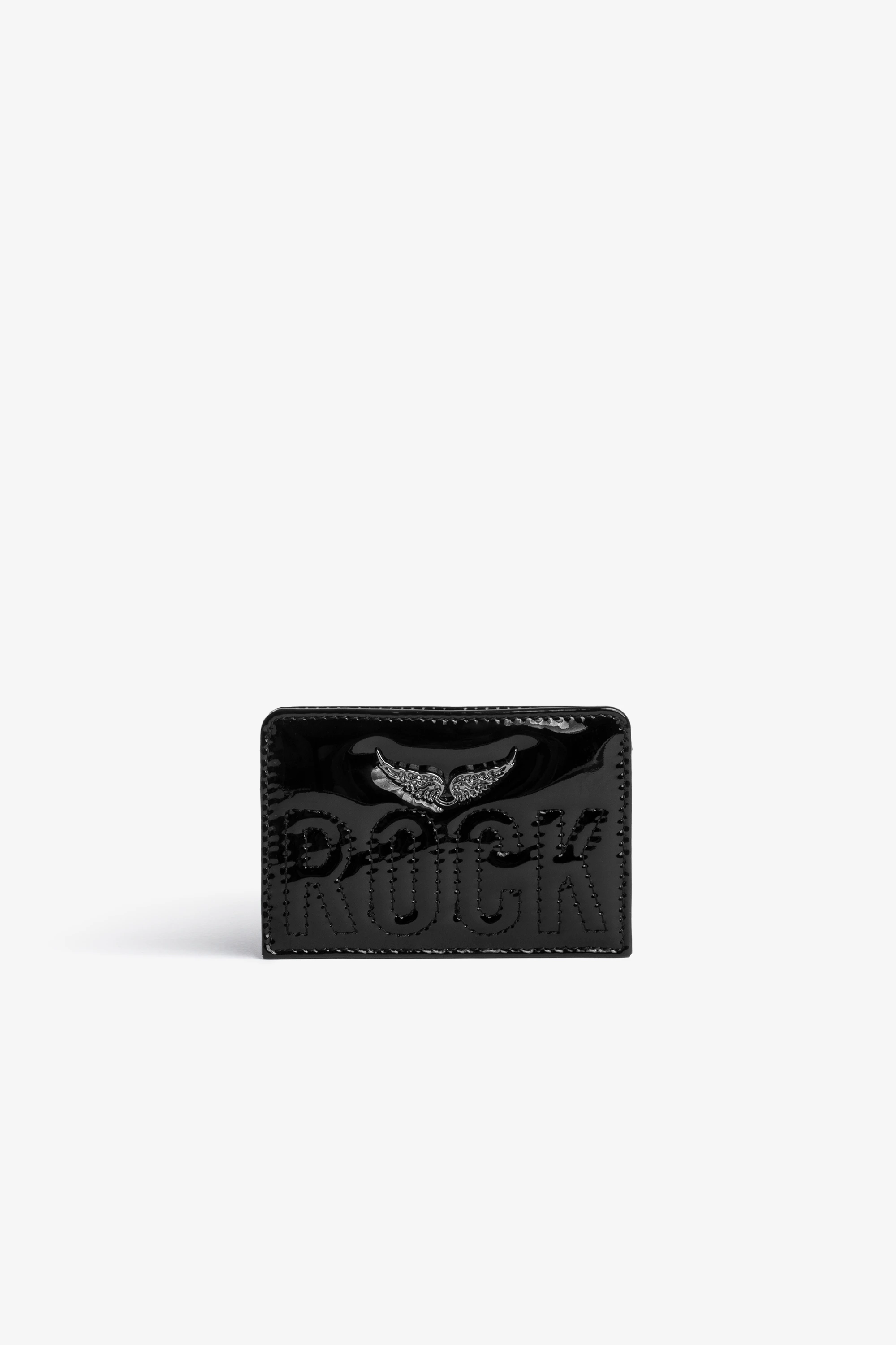 Porte-Cartes en cuir brillant noir orné du message "Rock" surpiqué et d'un charm ailes serties de cristaux femmeVoir plus