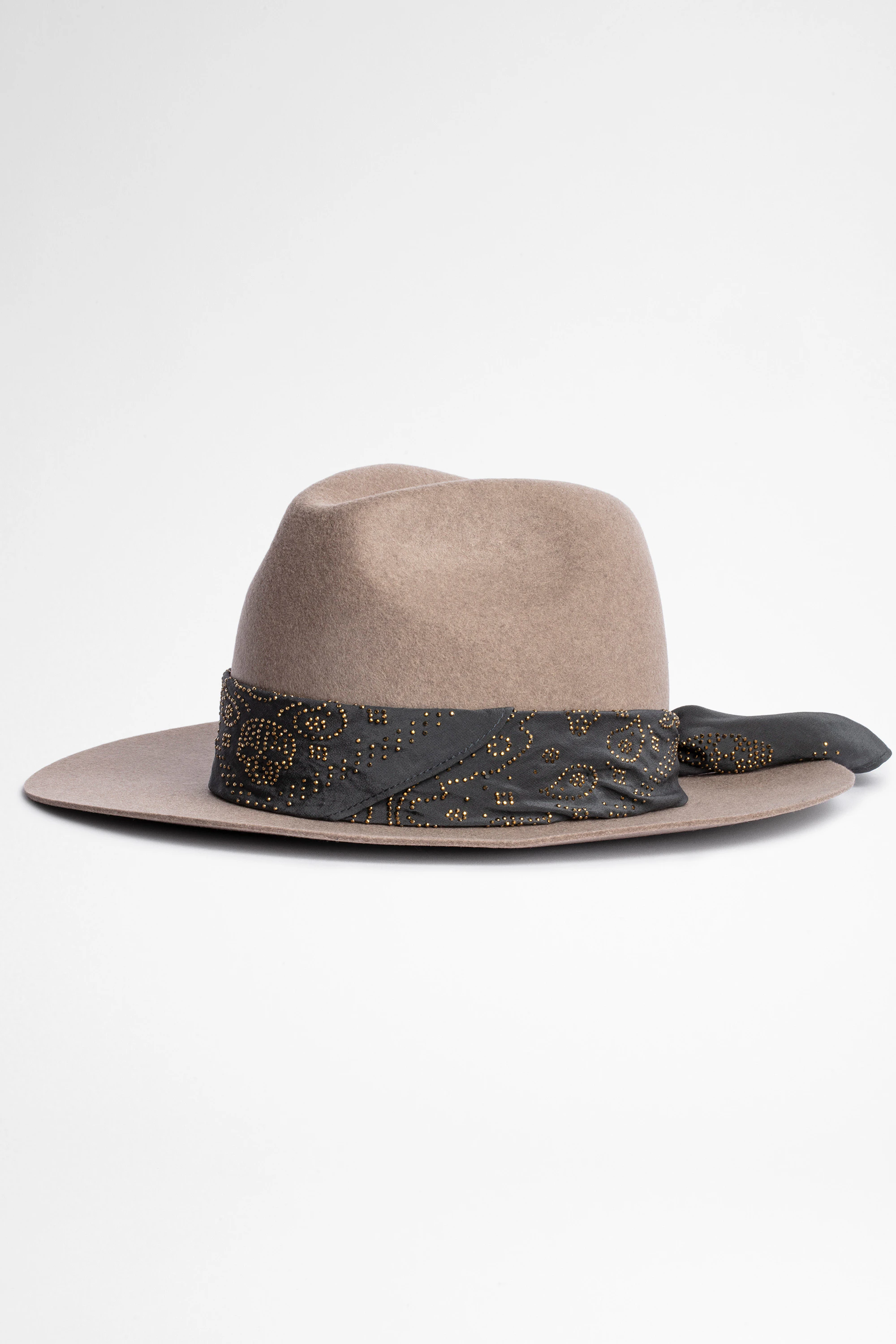 L'atout rock qui ponctue un look chic : un chapeau en laine orné d'un foulard en soie à l'imprimé bandana.