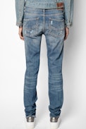 Jean bleu femme, effet usé coupe slim.