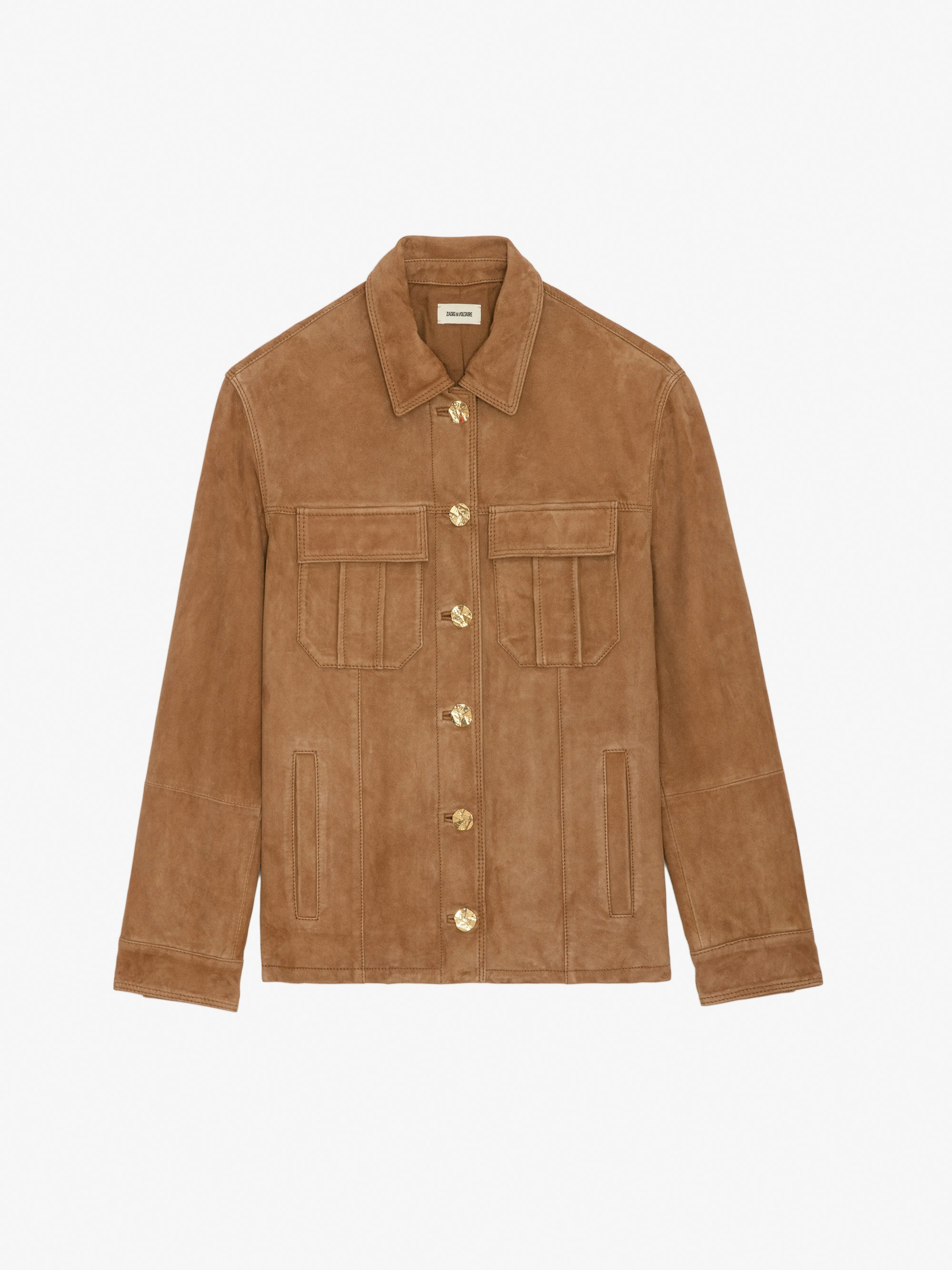 Veste en cuir suédé à manches longues, fermeture boutonnée et poches.