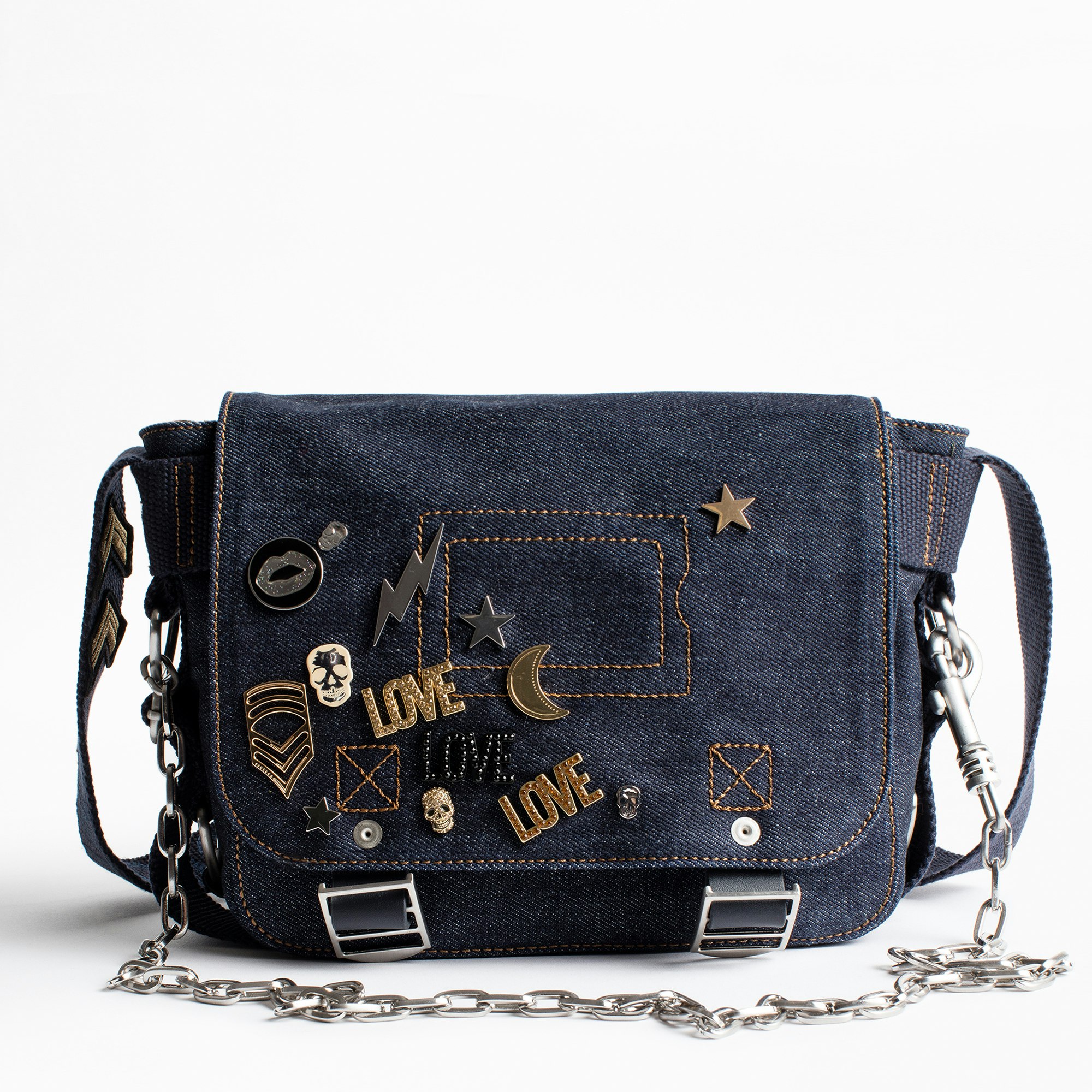 Sac besace denim Zadig&Voltaire, inspiration militaire, agrémenté de pins militaires, rabat à l'avant, portée épaule, bandoulière amovible.
