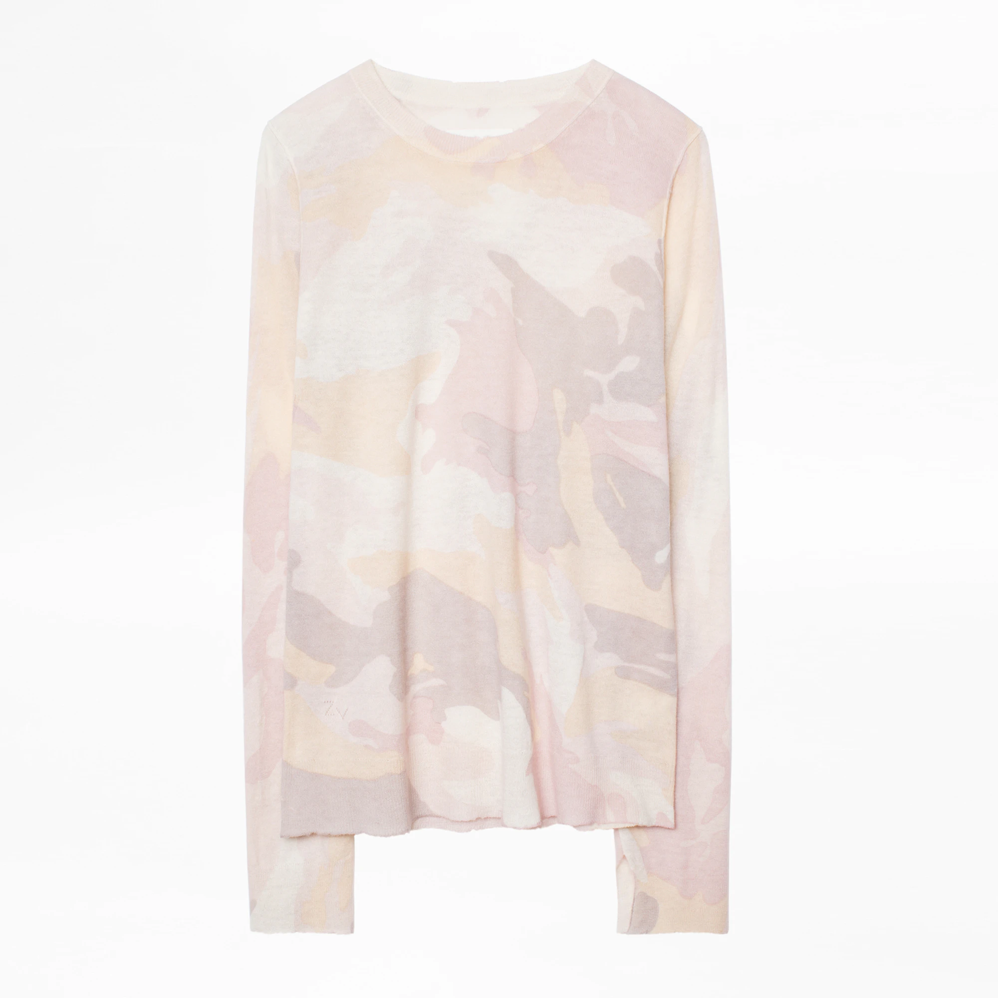 Pull femme en cachemire motif camouflage Zadig&Voltaire, un fil, modèle iconique, col rond, motif camouflage. Naturellement chaud, le cachemire plume est plus léger et délicat qu’un cachemire classique. Il est issu d’un tricotage plus fin, qui en fait une pièce d’exception.