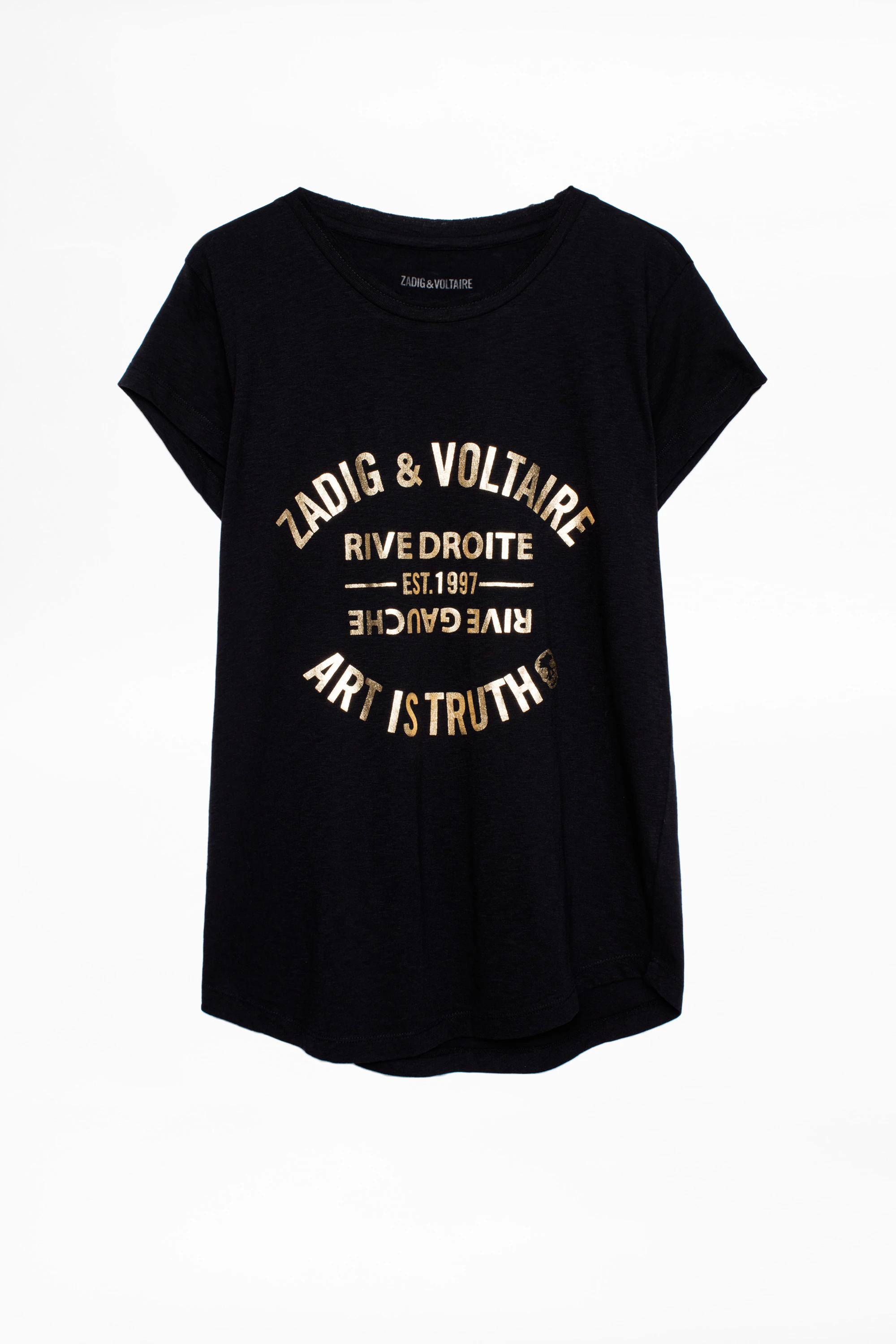 T-shirt noir femme Zadig&Voltaire, près du corps, en coton, manches courtes, col rond, imprimé blason en foil à l'avant.