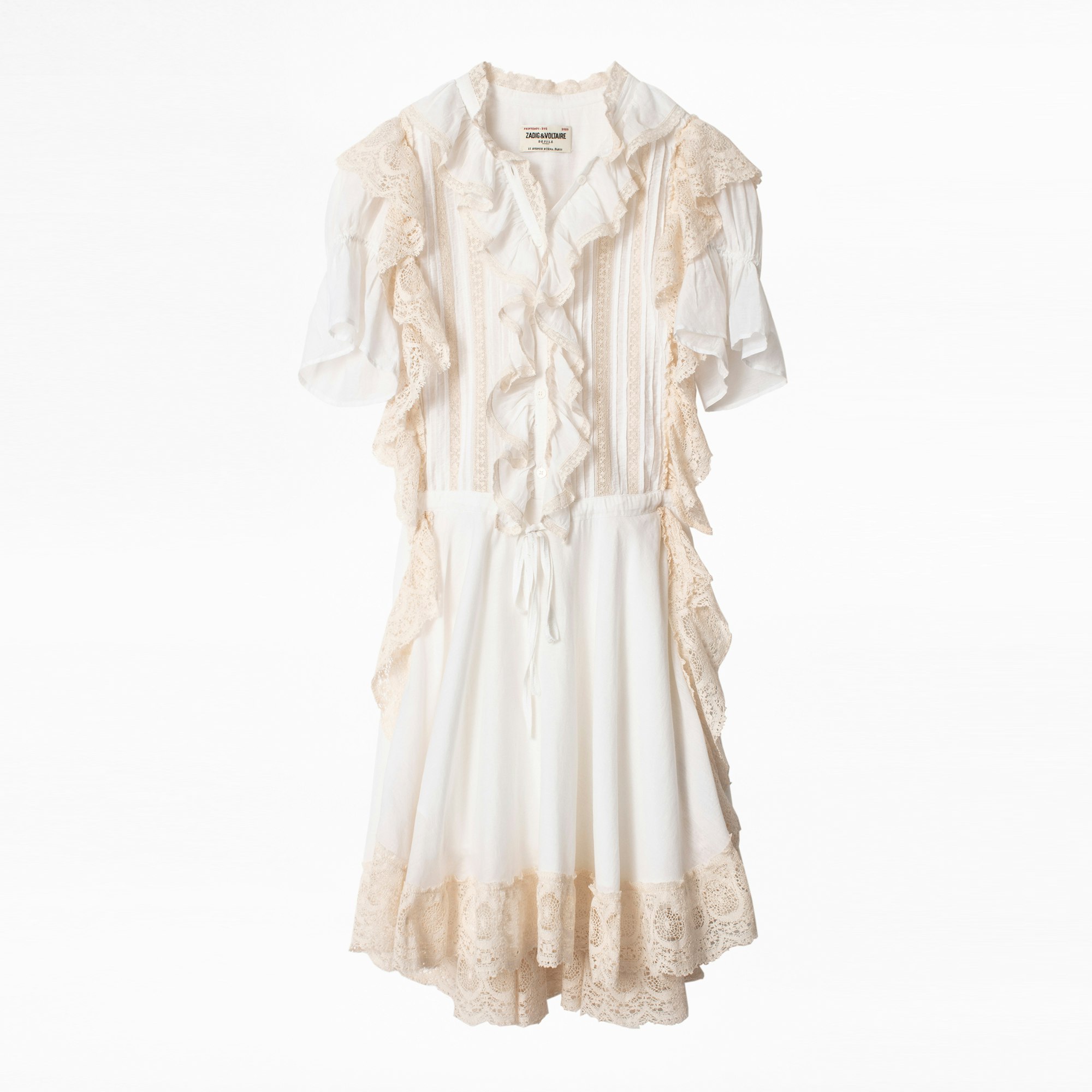 Robe blanche femme Zadig&Voltaire, courte asymétrique ceinturée et détails volants. Fashion show Spring Summer 20.