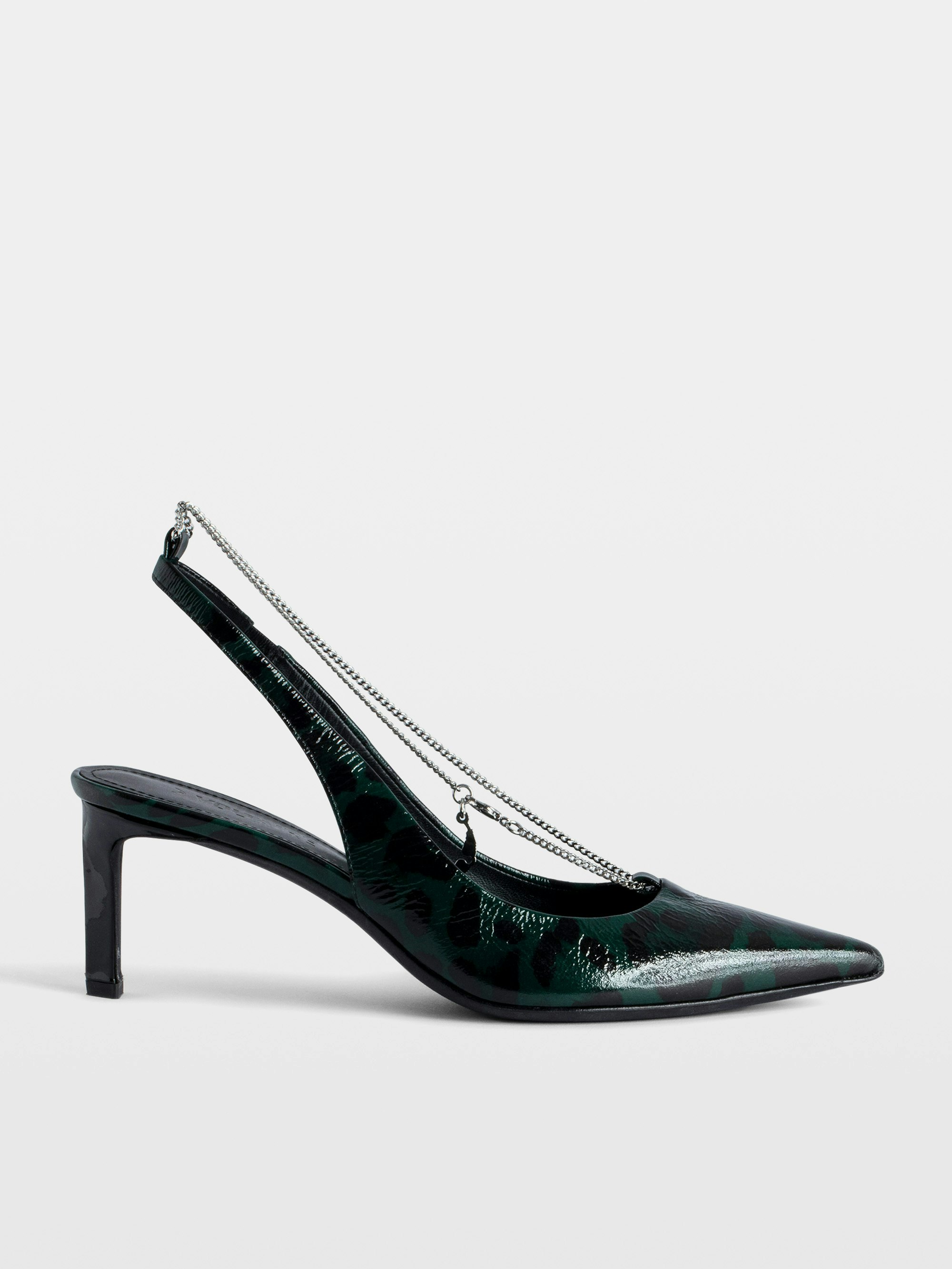 Escarpins en cuir vernis imprimé léopard à chaîne.