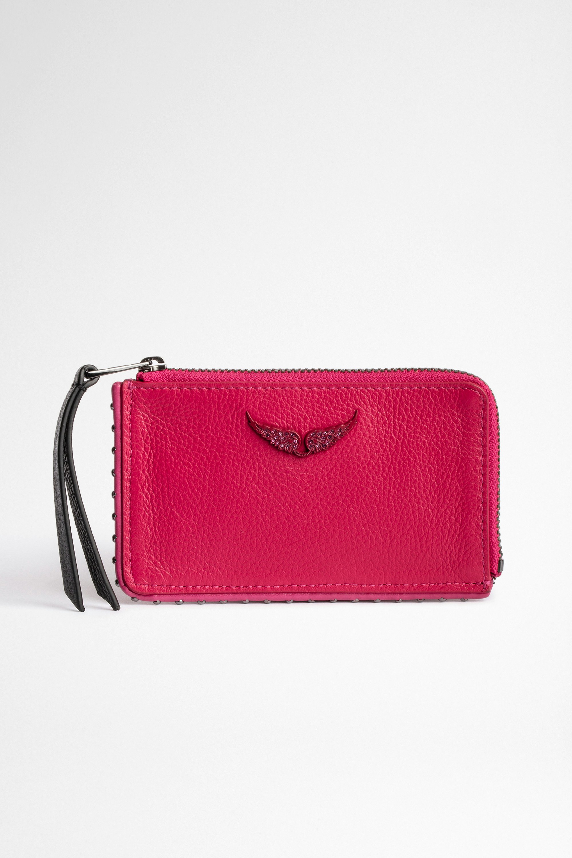 Nouveauté de la saison Automne-Hiver 21, le ZV Card en cuir rose soutenu Zadig&Voltaire, agrémentée des ailes iconiques de la Maison, facilite avec élégance le quotidien grâce à son double usage, mini-pochette et porte-carte.