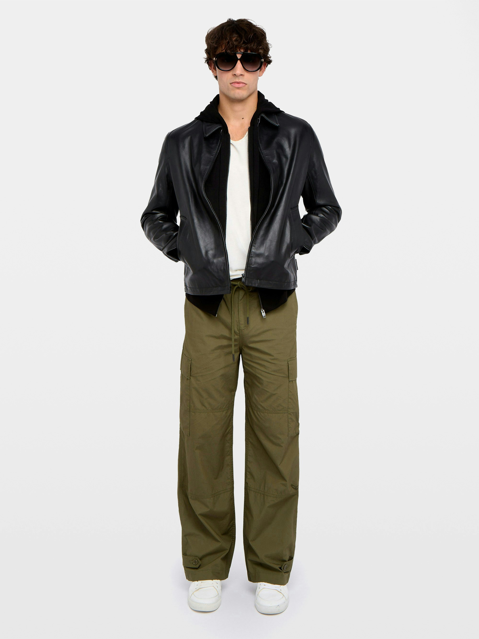 Pantalon large et fluide à taille élastiquée avec cordon, boutonnage central et fermeture zippée accompagné d'une broderie.