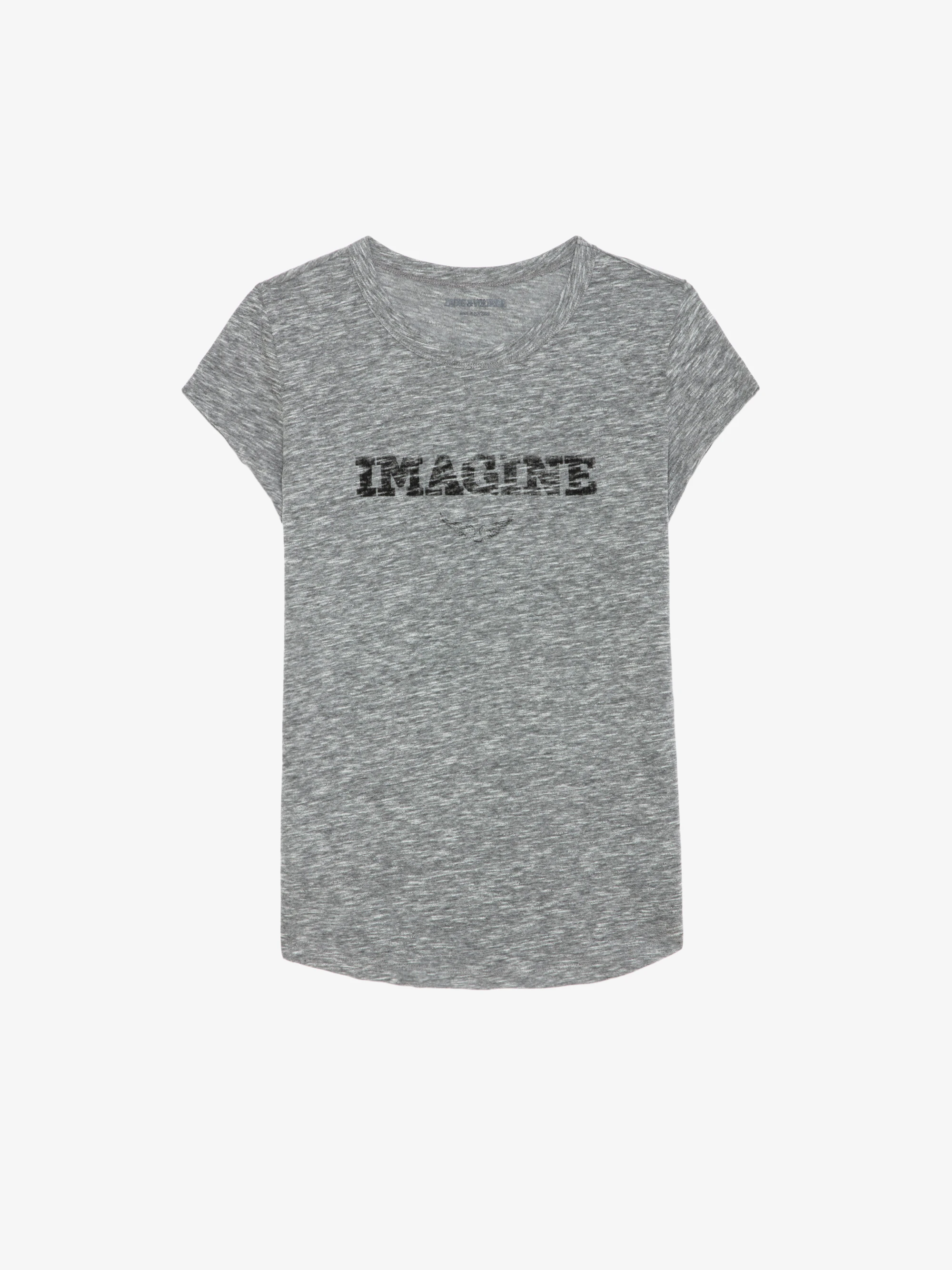 T-shirt grigio screziato a maniche corte con stampa "Imagine" e ali effetto consumato sul davanti.Vedi di più