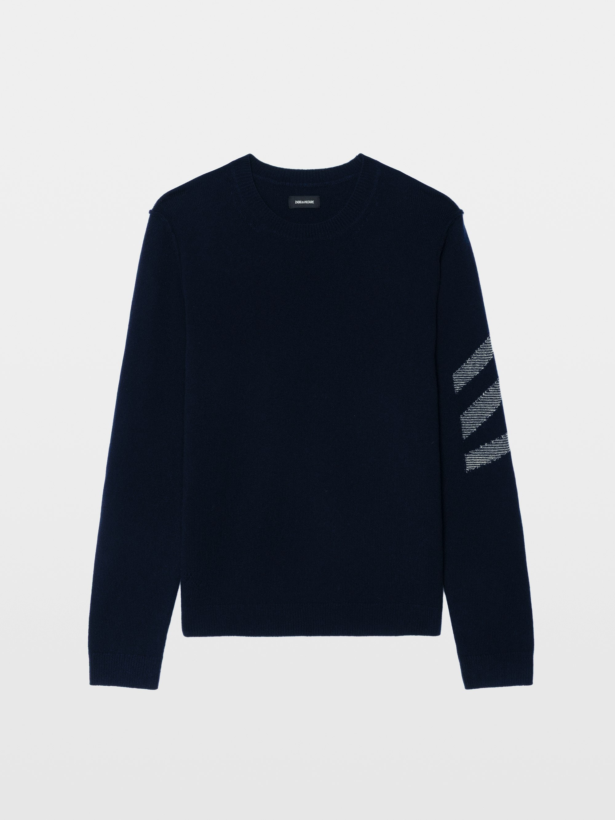 Pullover in 100% cashmere blu navy con maniche lunghe e freccia sul braccio sinistro.