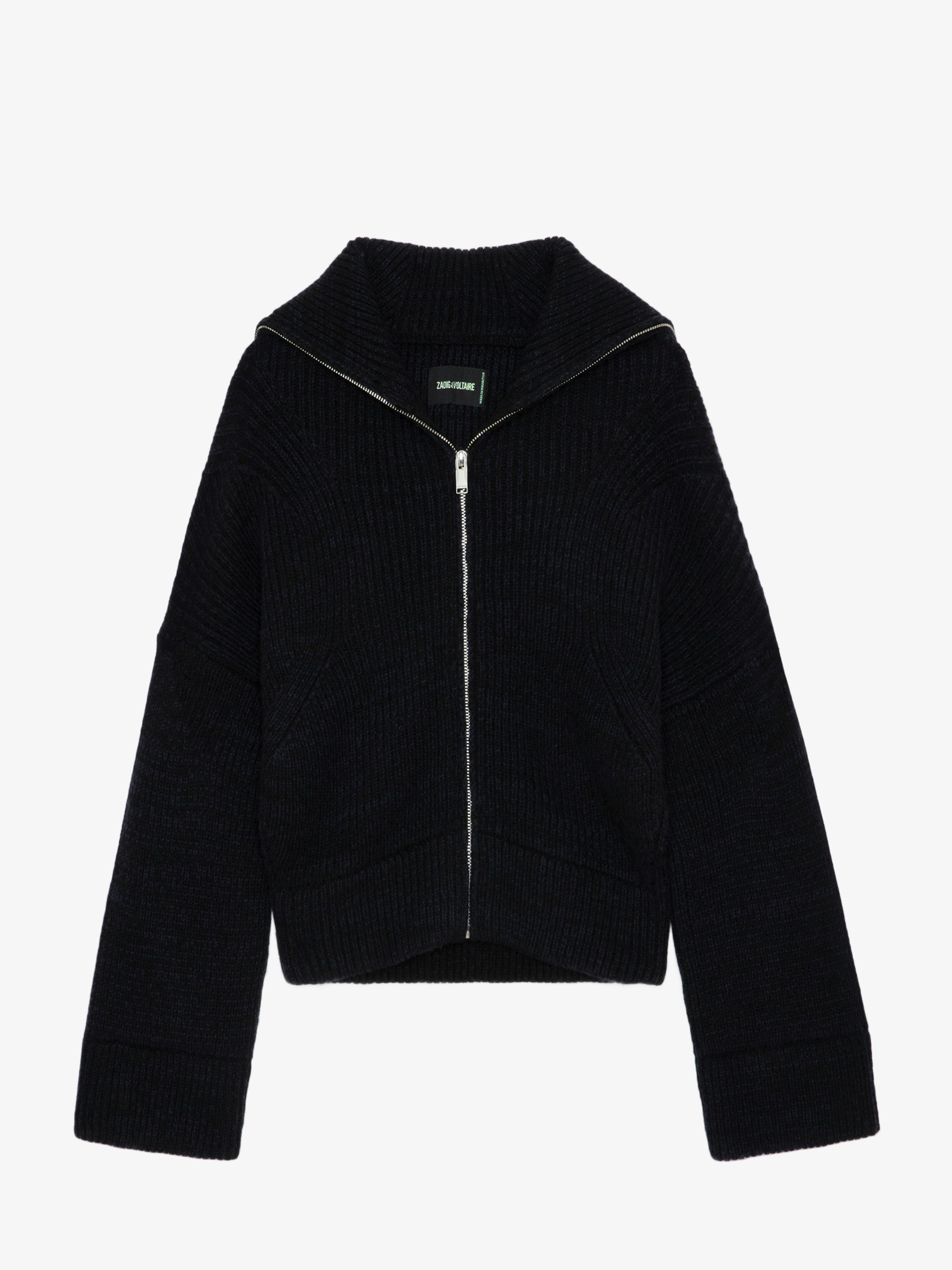 Giubbotto corto con cerniera in lana e cachemire intrecciato nero con collo alto alla marinara e ali metalliche sul retro.Vedi di più
