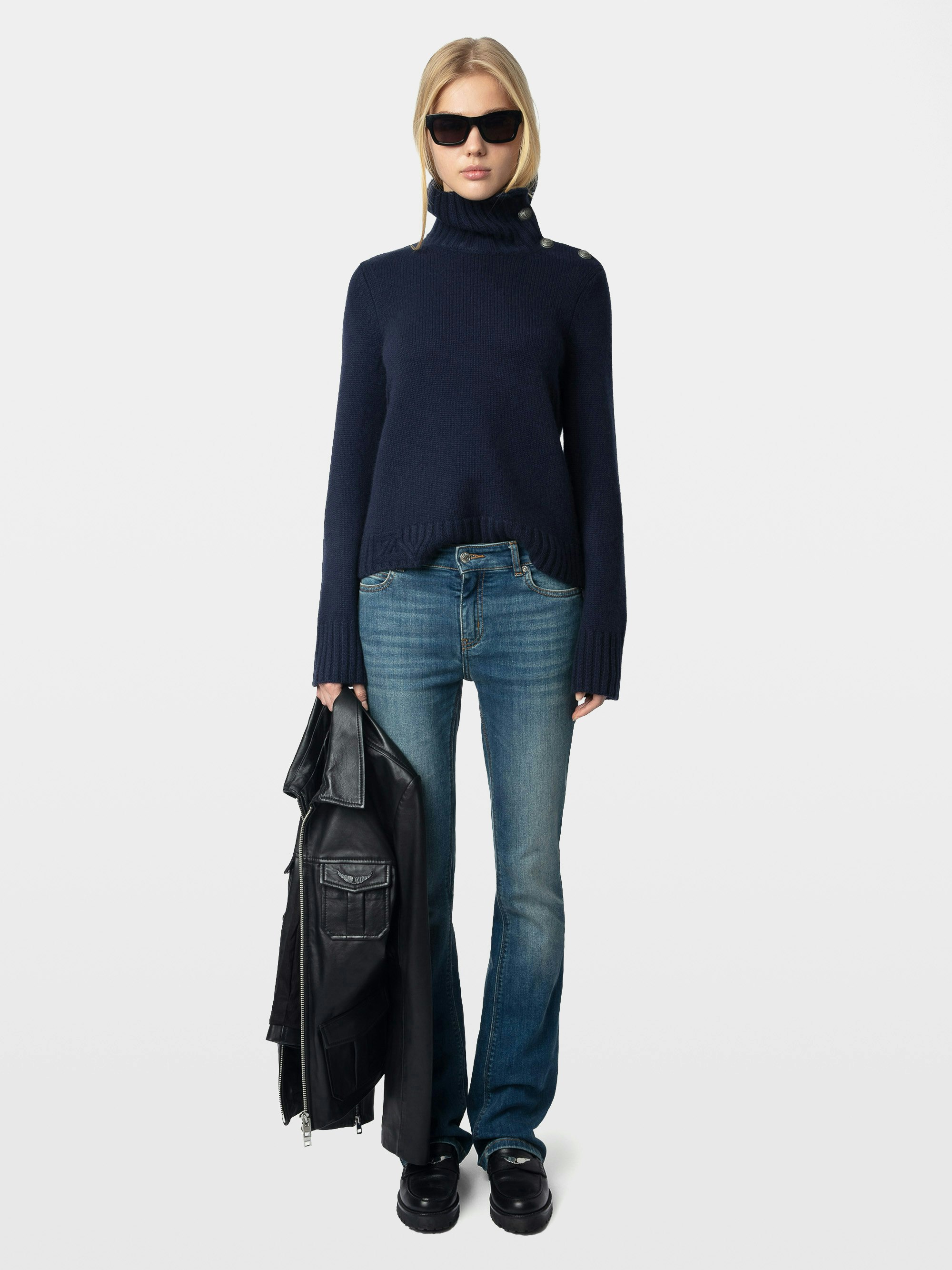 Maglione in 100% cashmere blu navy con collo alto e bottoni sulla spalla.