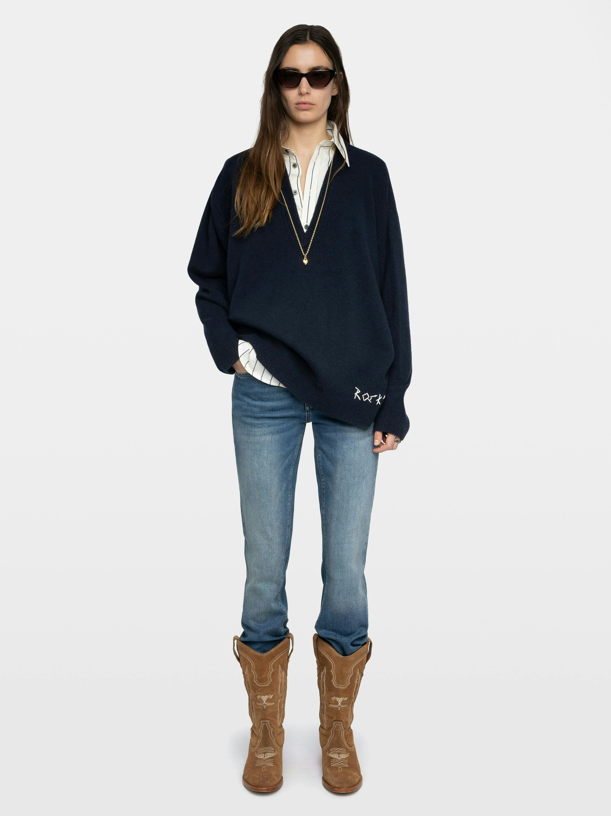 Maglia oversize con scollo a V e ricamo a mano sul fondo.