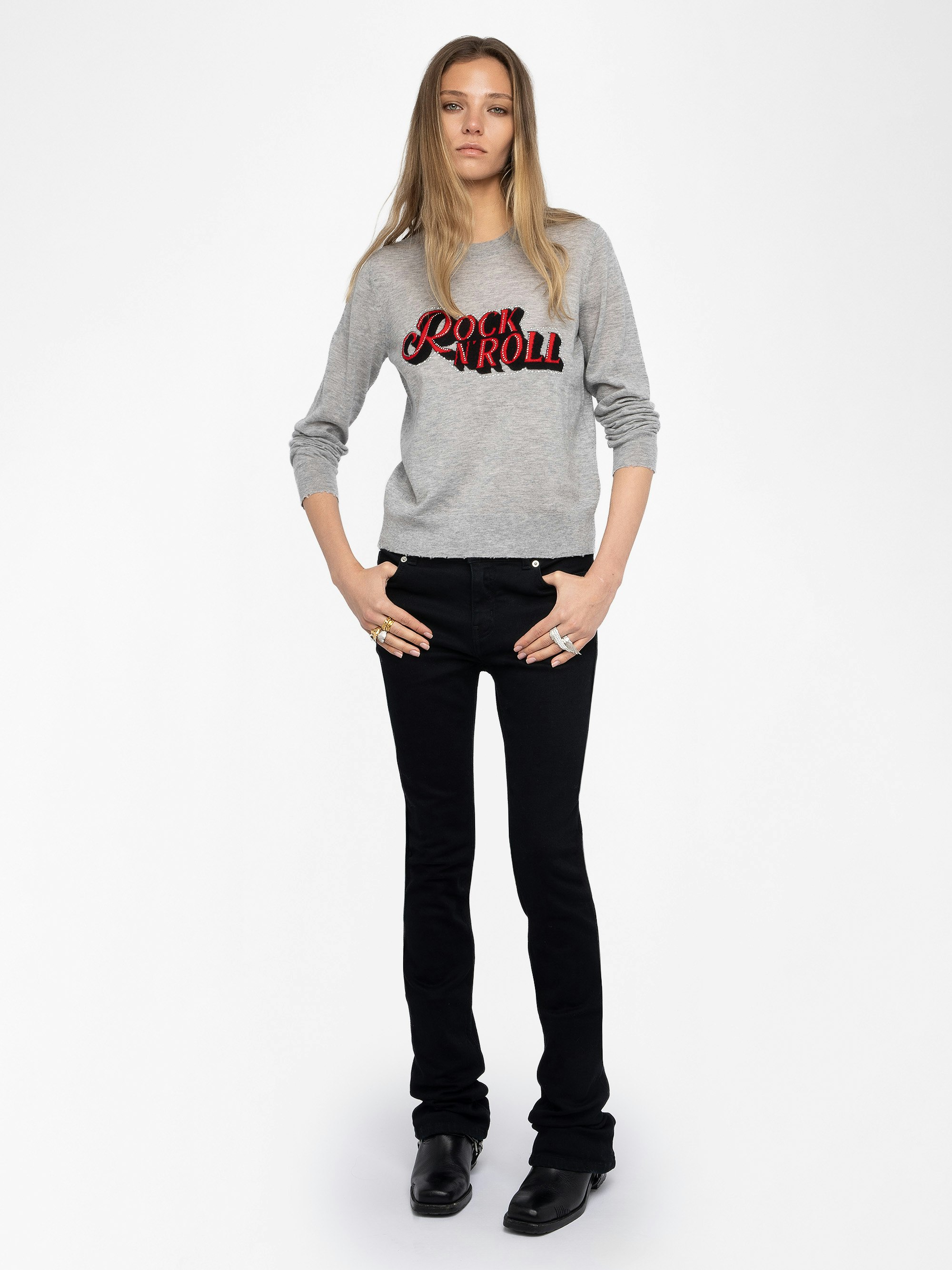 Maglia girocollo con intarsia e strass Rock&Roll sul davanti.