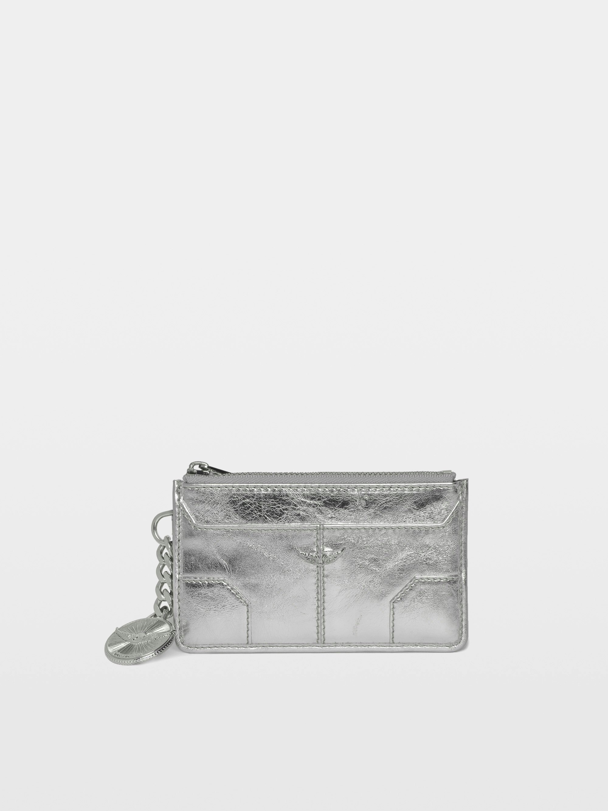 Portacarte in pelle metallizzata con charm a medaglione e firme ad ali.