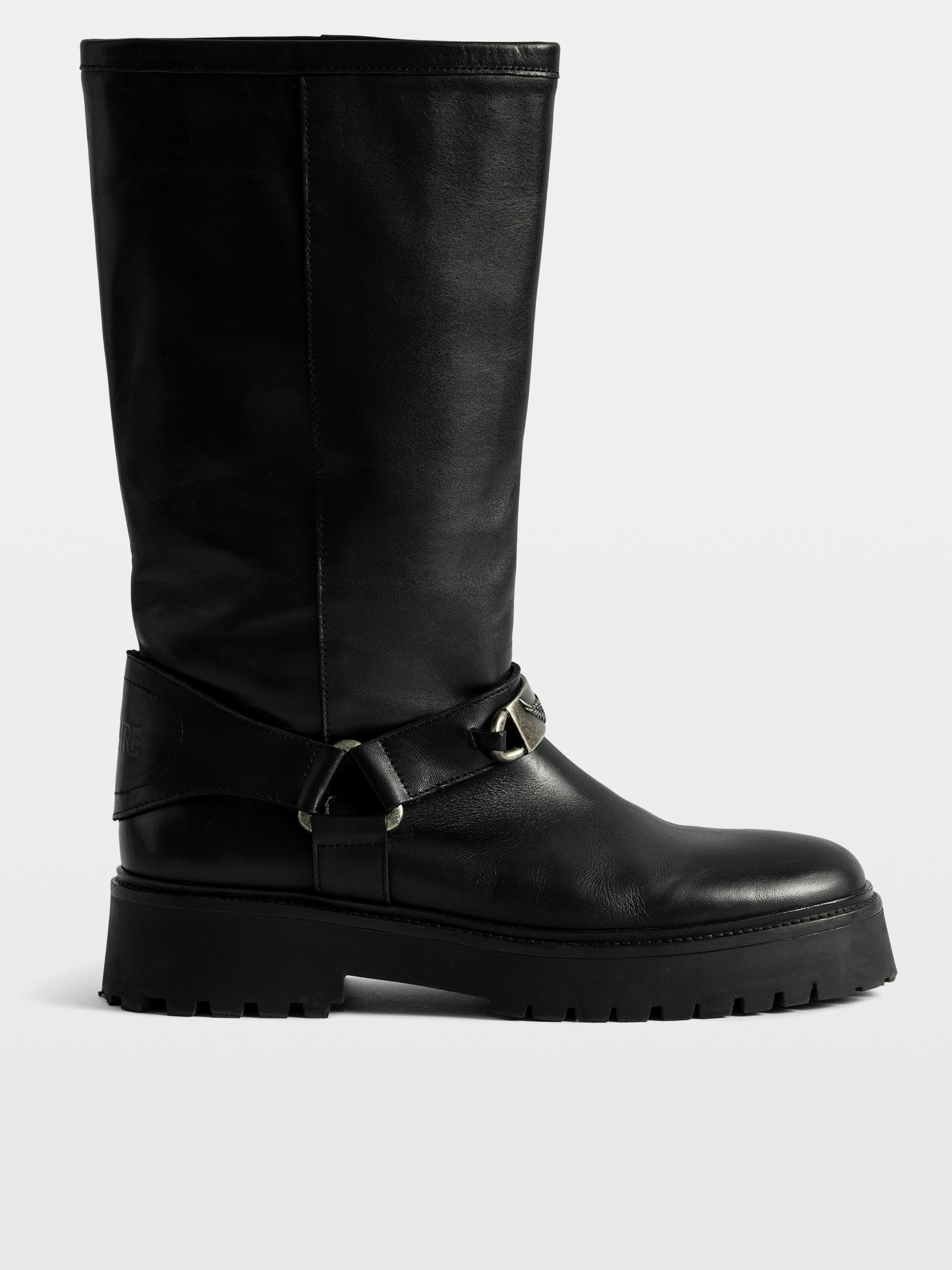 Stivaletti in pelle di ispirazione biker con finimenti ornati di catenelle.