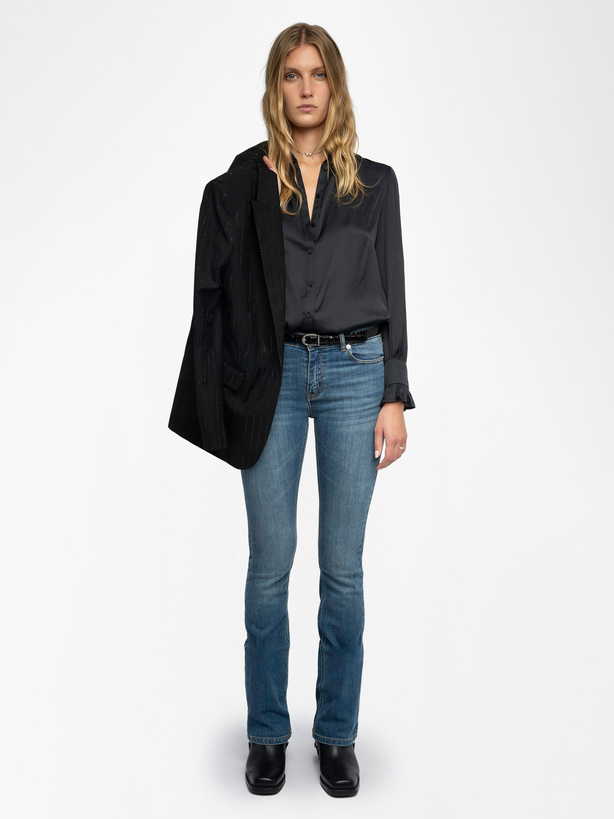 Camicia in raso, maniche lunghe, chiusura con bottoni e strass a forma d'ala sul retro.