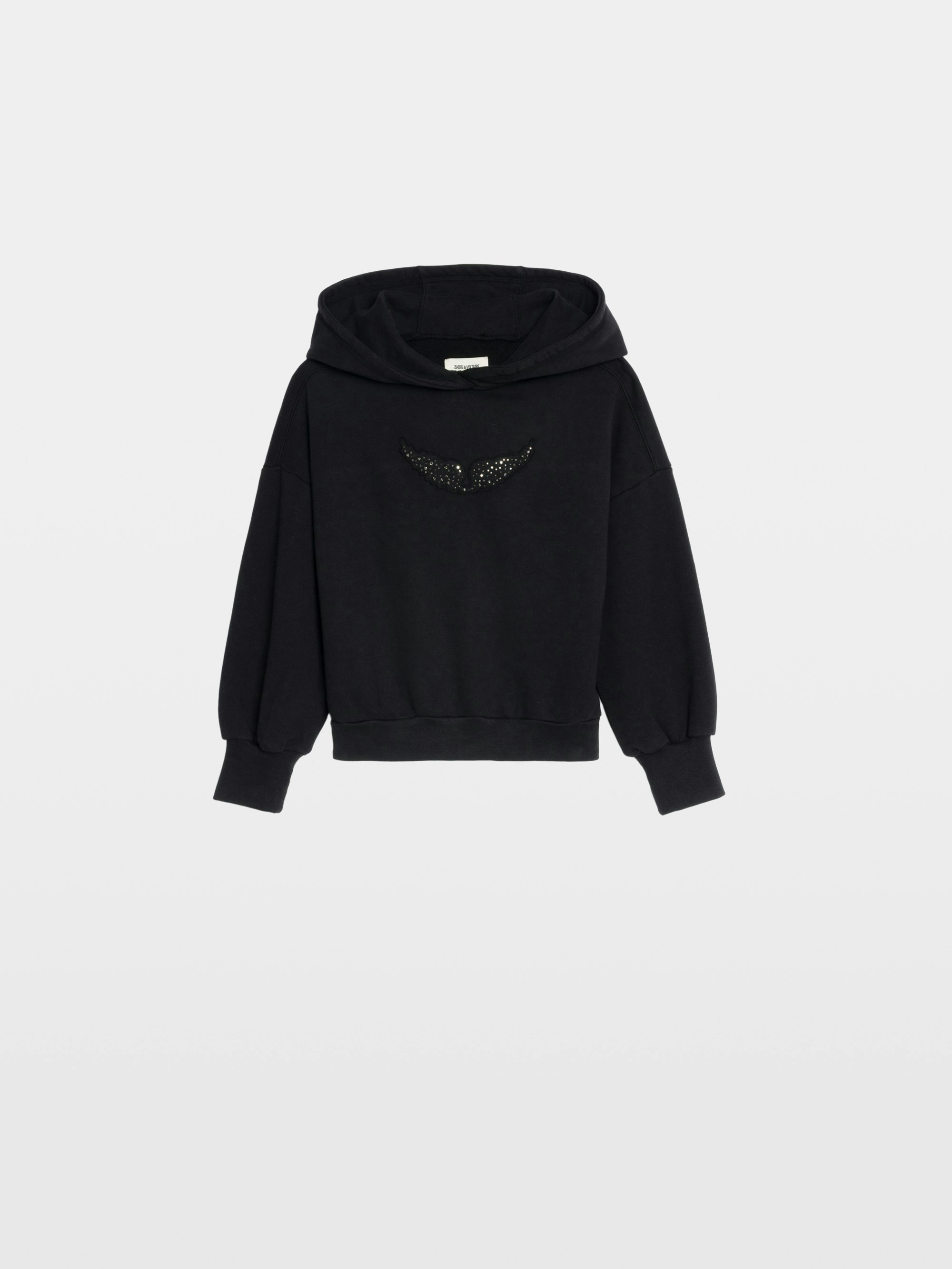 Cotton hooded sweatshirt with rhinestone wing logo on the front.
