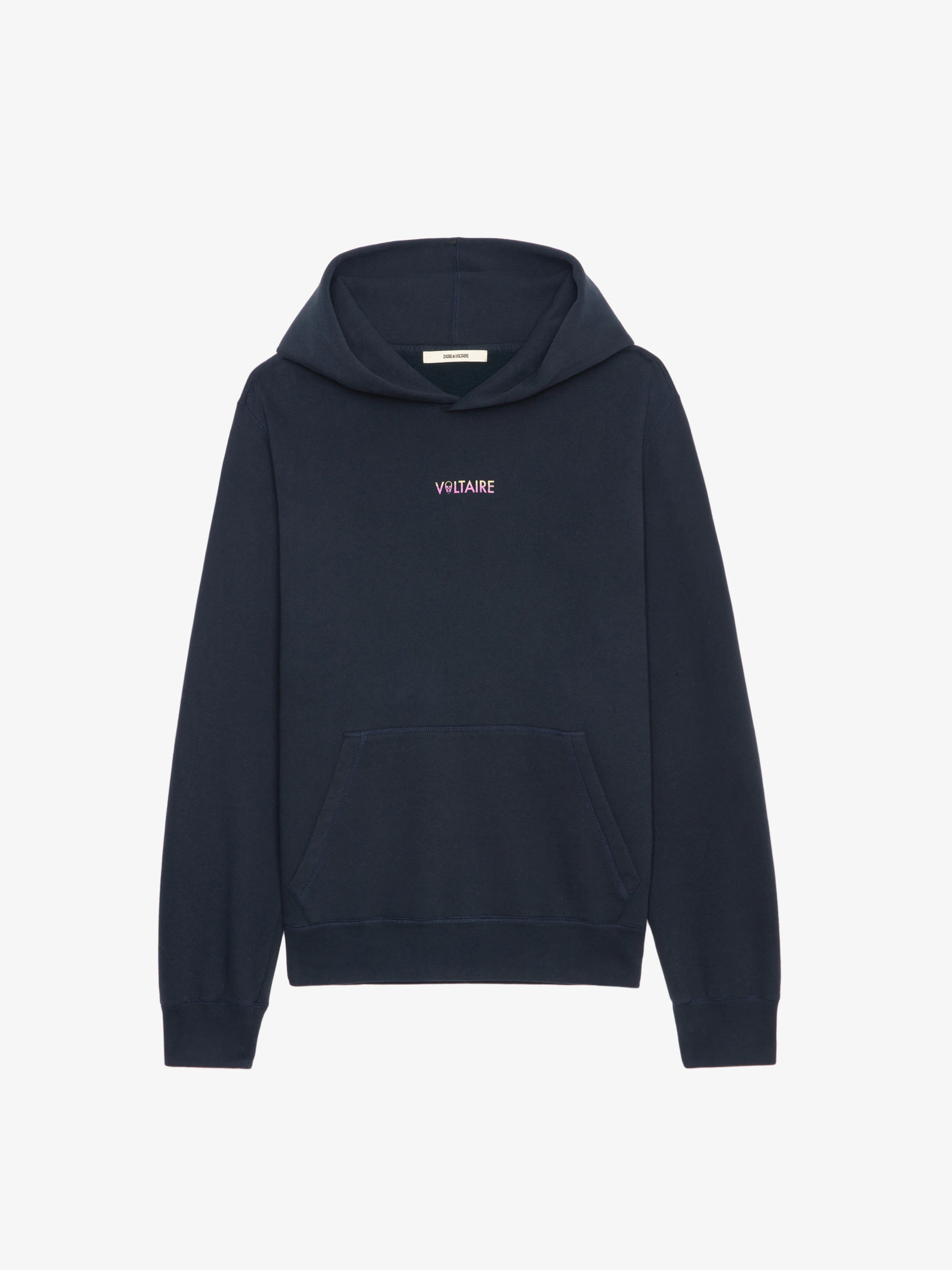 Navy blue fleece hoodie with long sleeves, featuring "Voltaire" print on the front and Concert graphic on the back.