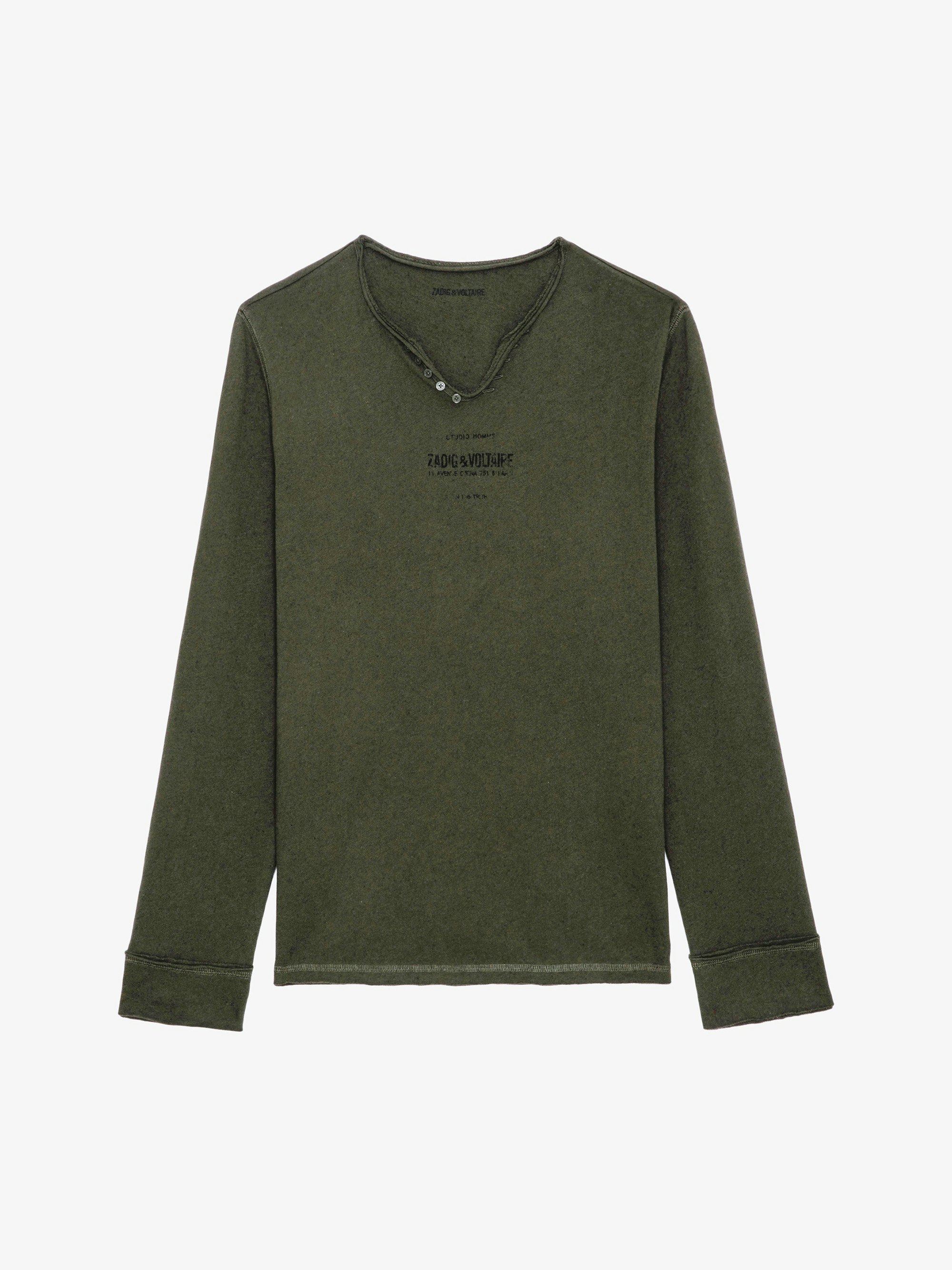 Khaki washed linen Henley T-shirt with printed Studio Homme insignia.