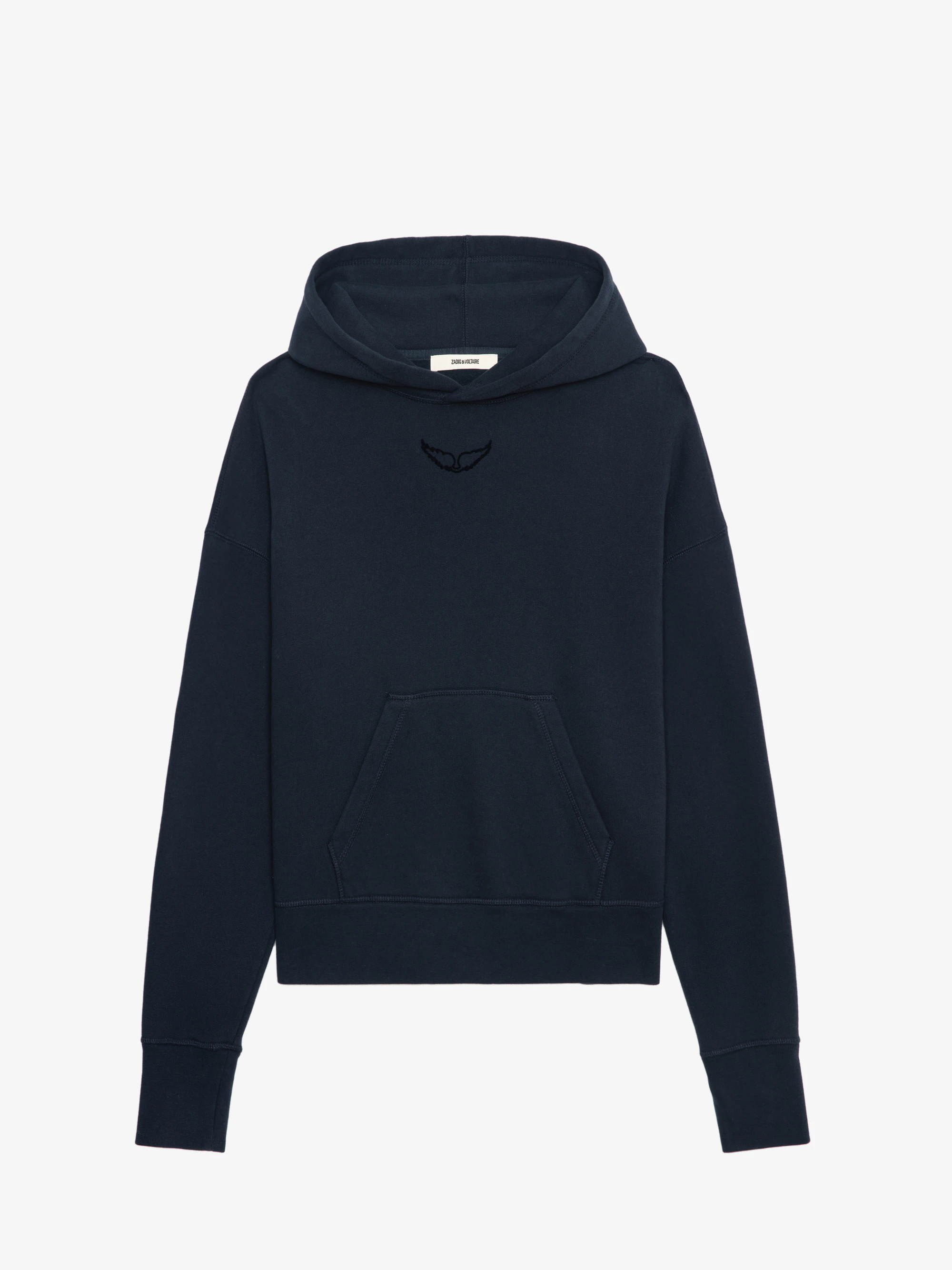Navy blue oversized hoodie sweatshirt in fleece, with long sleeves, wings print on the front and Fallen Angel "Rock'n'Roll" on the back.