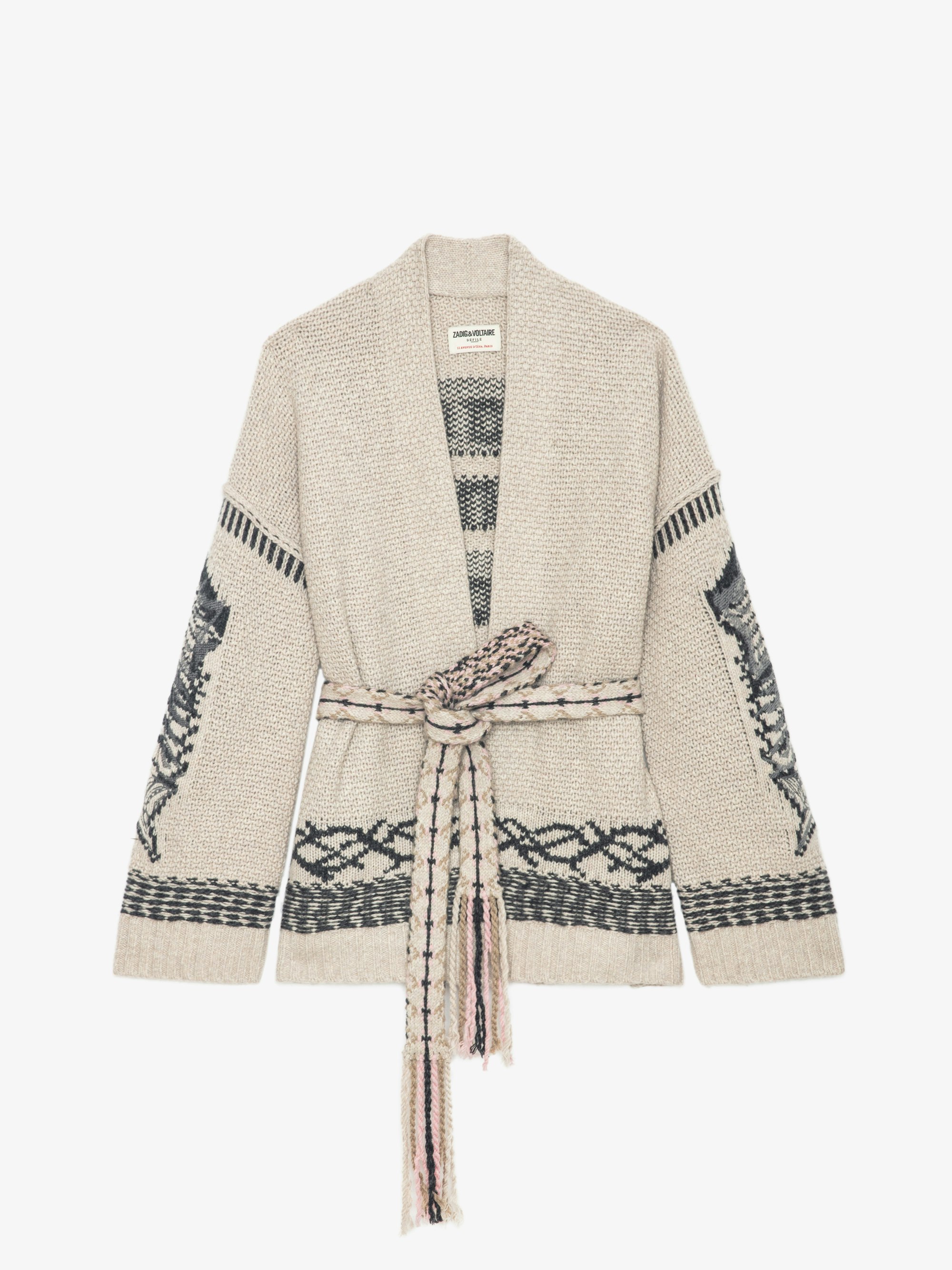 Beige merino wool and cashmere cardigan with contrasting patterns and removable belt.