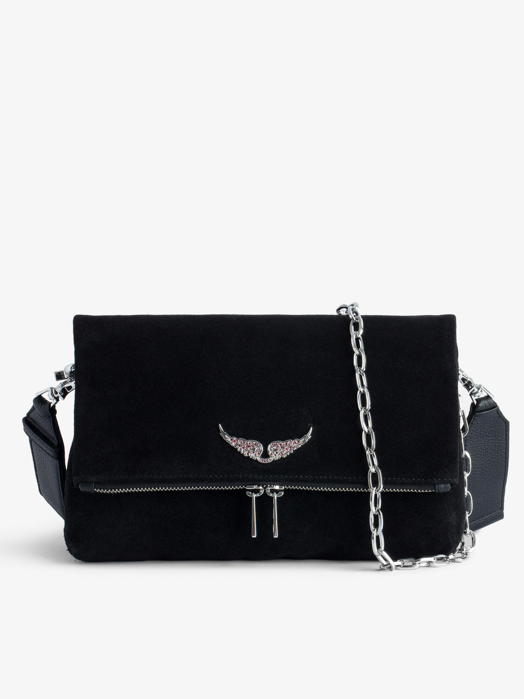 Rocky black suede bag with leather shoulder strap and metal chain.