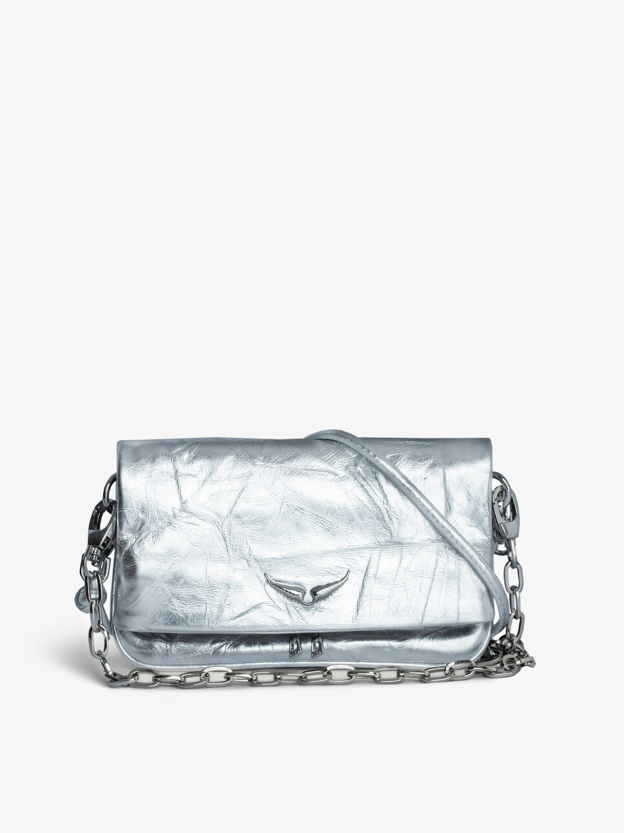 Rock Nano small silver metallic crinkled leather clutch with double leather and chain strap.See more