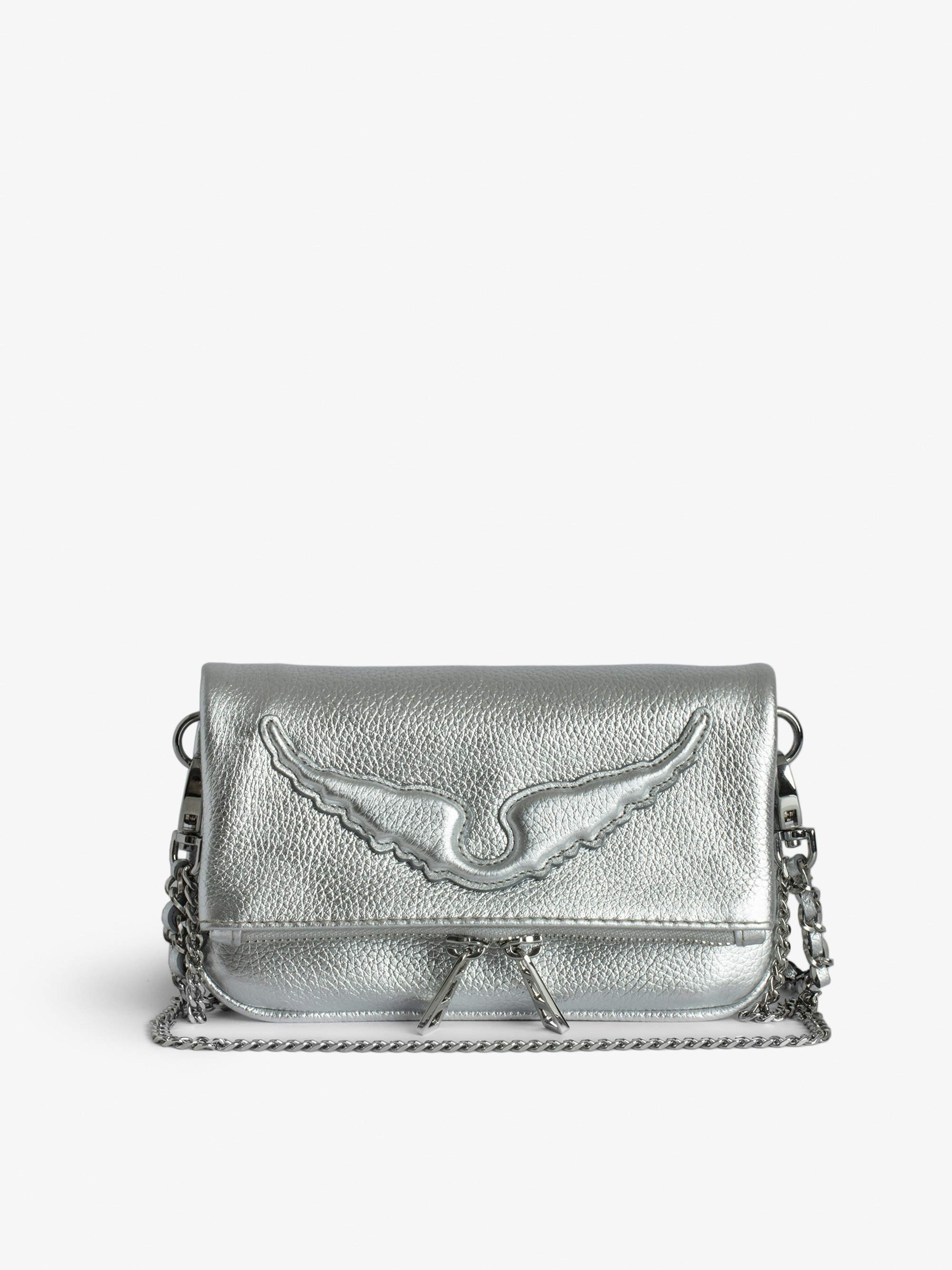 Small silver-tone metallic grained leather clutch with double chain and signature embossed wings.