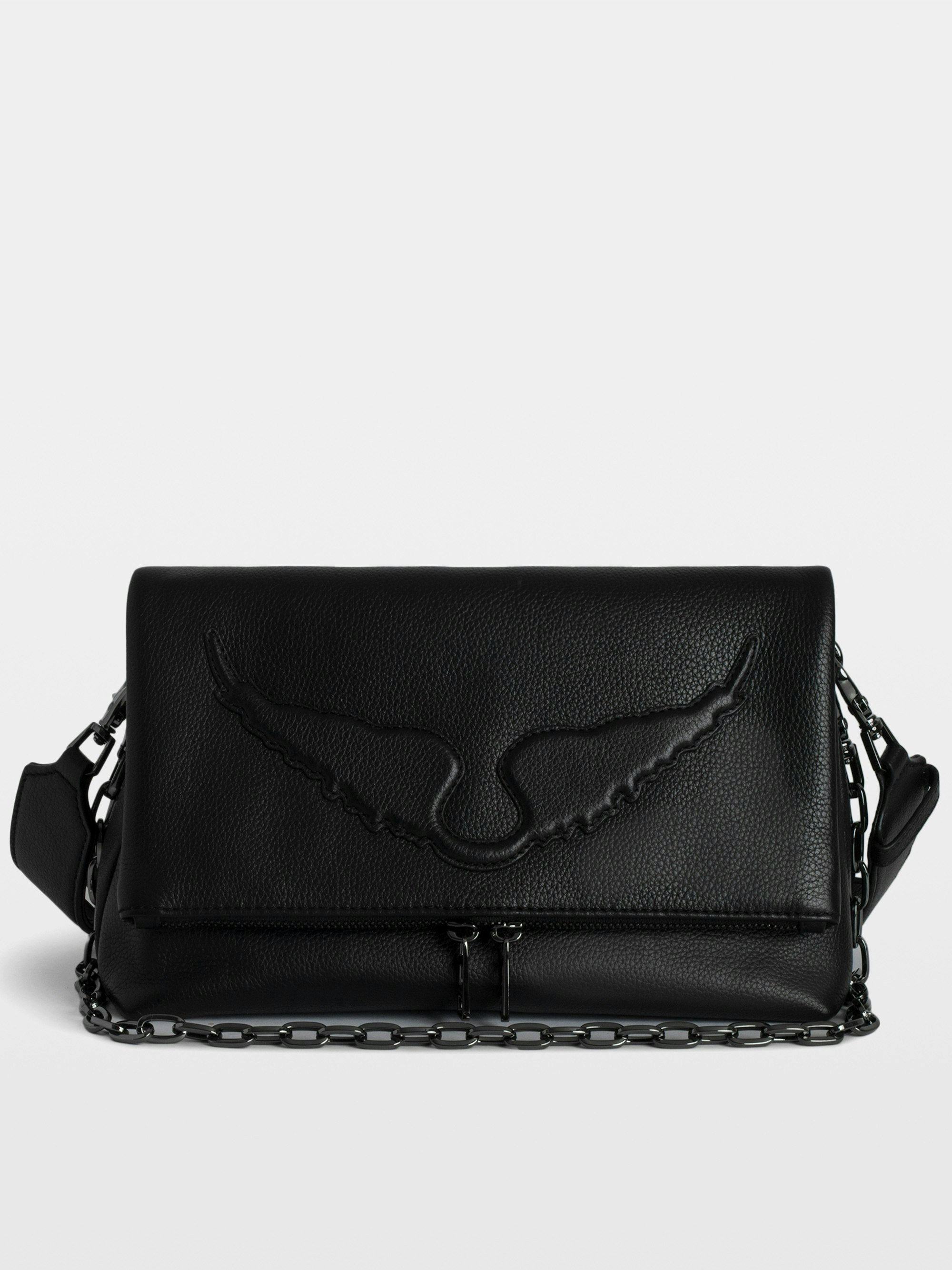 Grained leather bag with chain, shoulder strap and embossed wing signature.