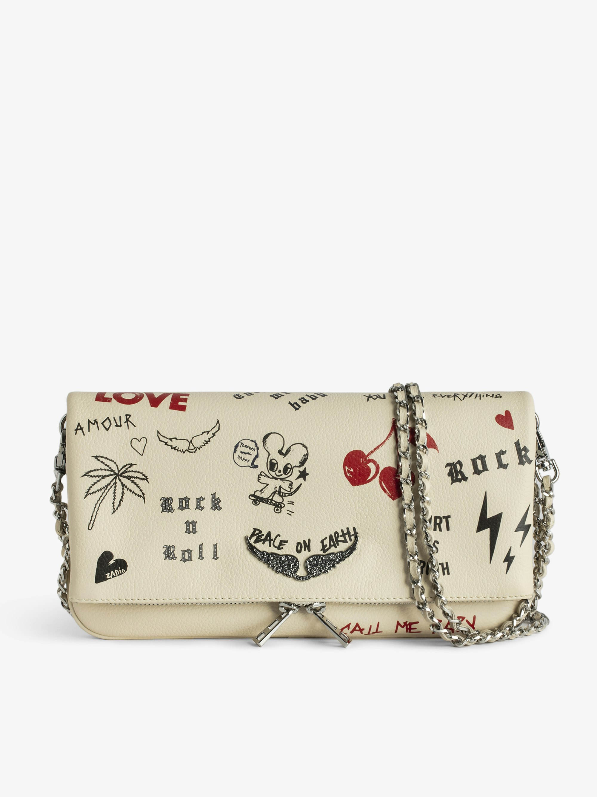 Grained leather Love Tag clutch with double leather and metal chain, and wings adorned with rhinestones.See more