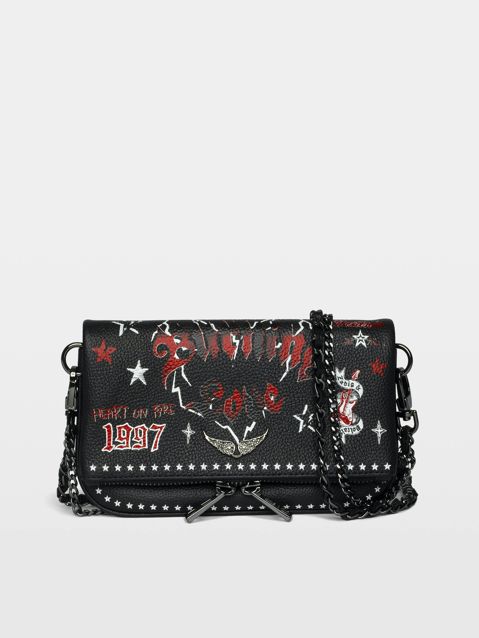 Punk grained leather clutch with double leather and metal chains and rhinestone-embellished wings.
