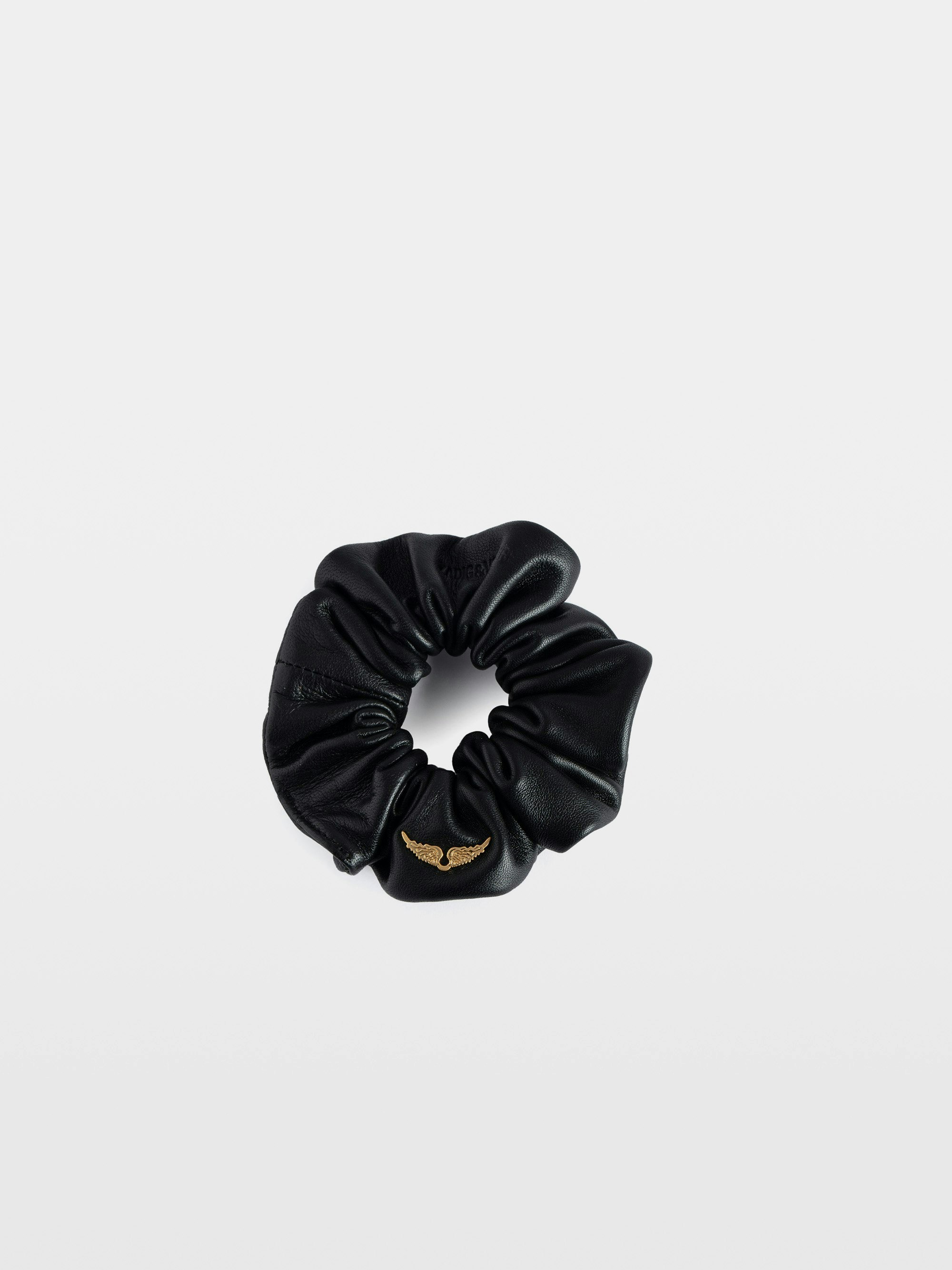 Voltaire Vice scrunchie in black leather with wing motifs.