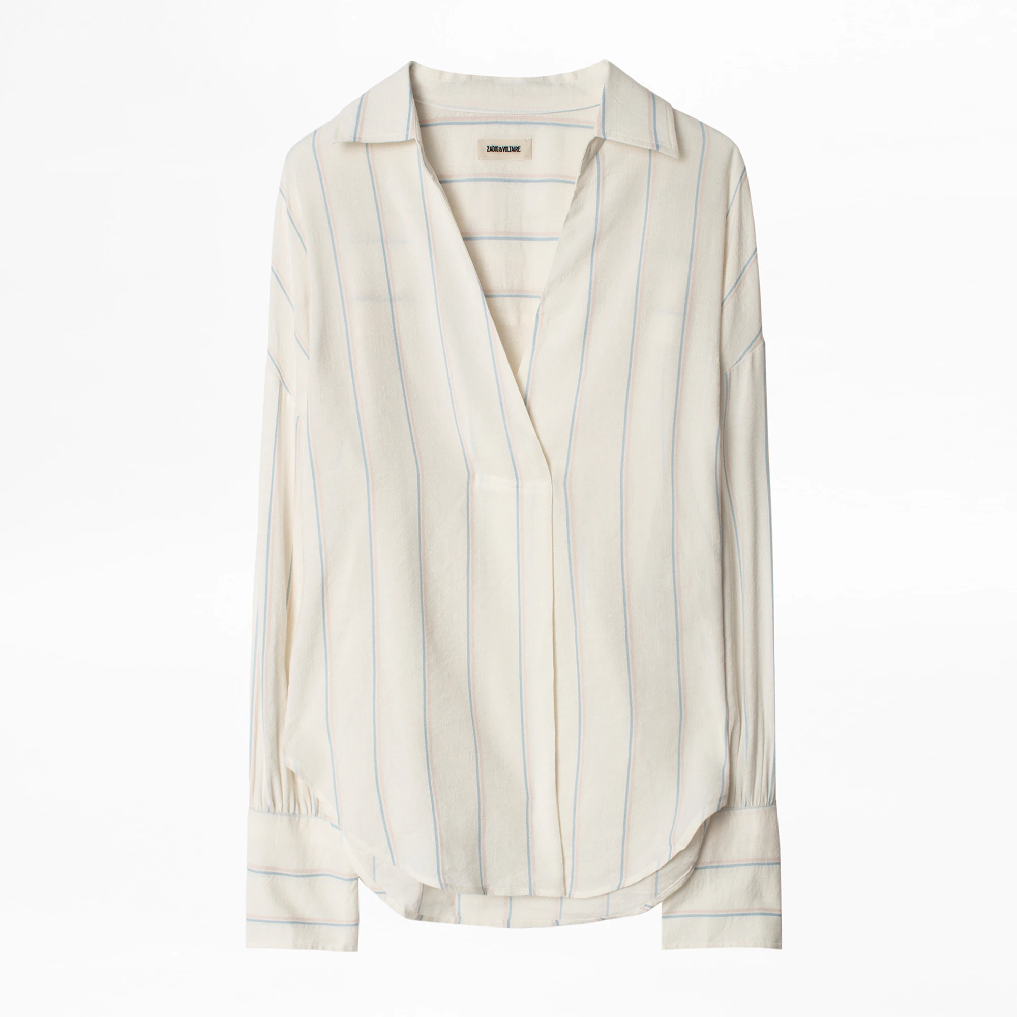 Zadig&Voltaire women’s white tunic, striped, long sleeves, “VOLTAIRE” printed on the back. Made in Portugal.