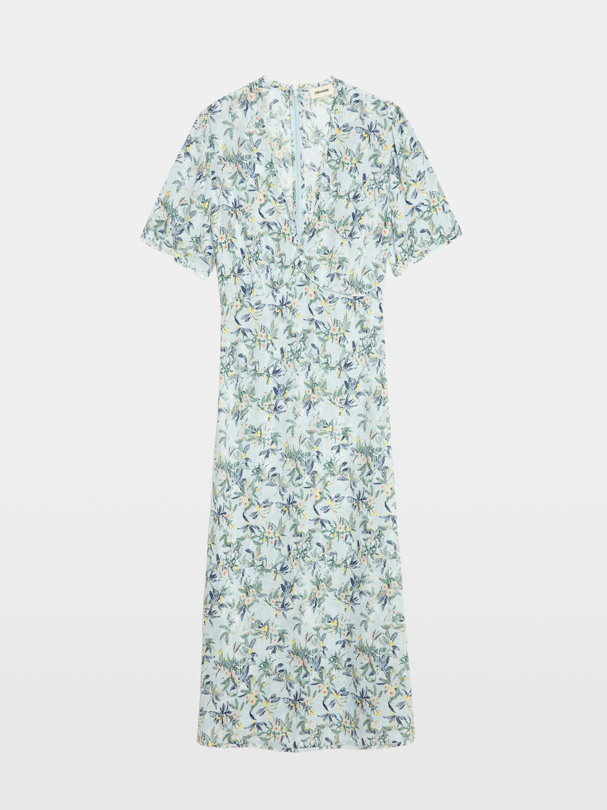 Mid-length printed viscose dress with short sleeves and buttoned neckline.
