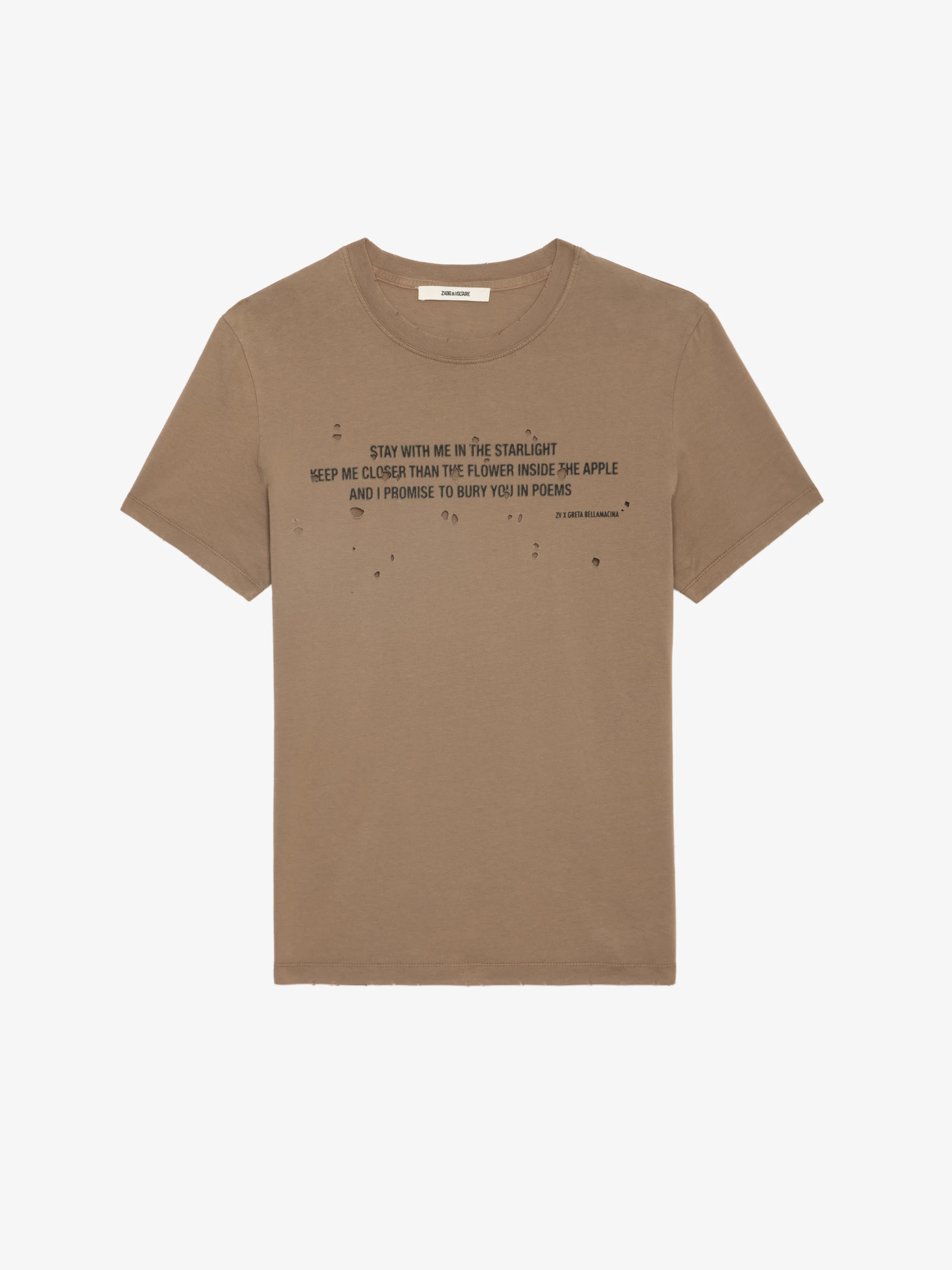 Brown organic cotton distressed effect T-shirt with short sleeves and Greta poem printed on the front.See more