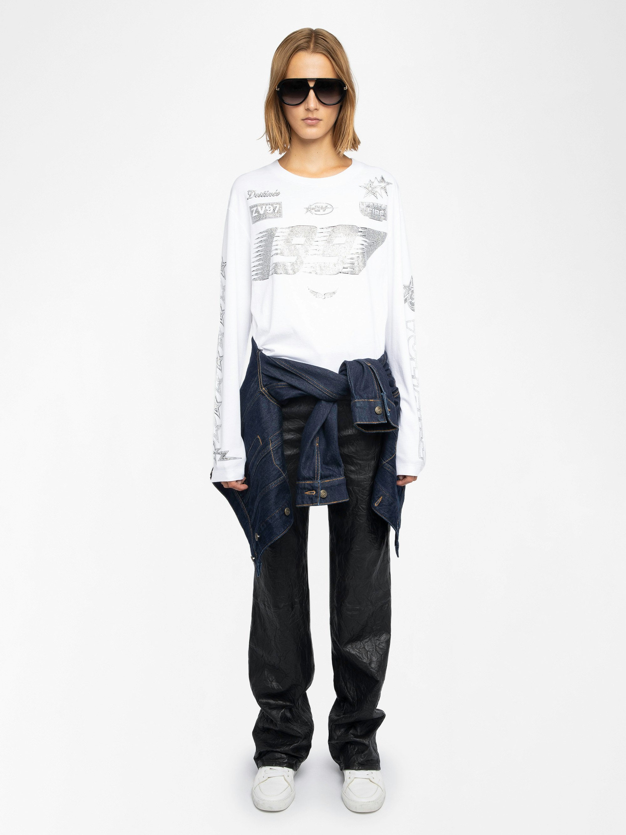 Short long-sleeved t-shirt with round neck featuring print and rhinestones.