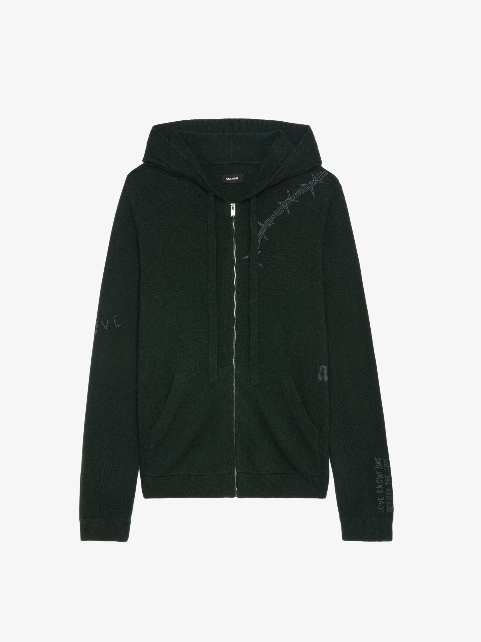 Dark green zipped cardigan in merino wool and cashmere with long sleeves and tattoo motifs.See more