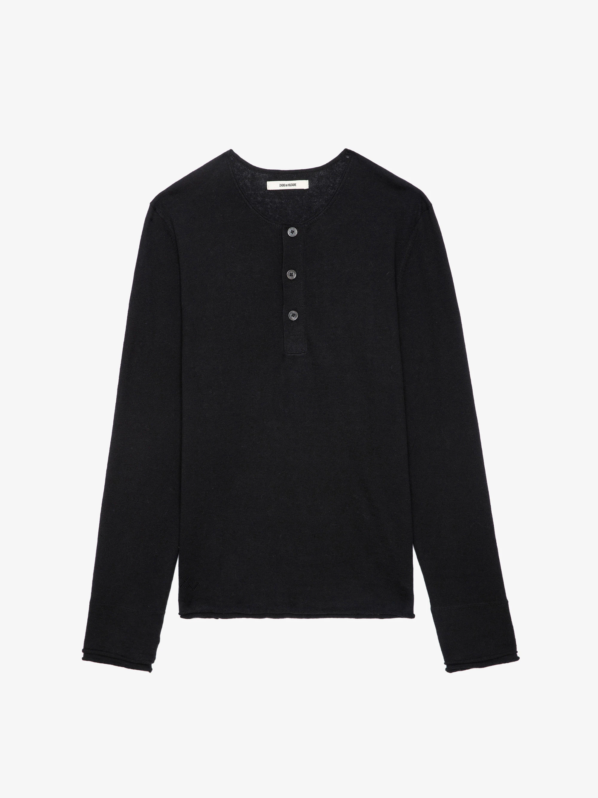 Black long-sleeved sweater with buttoned collar.See more